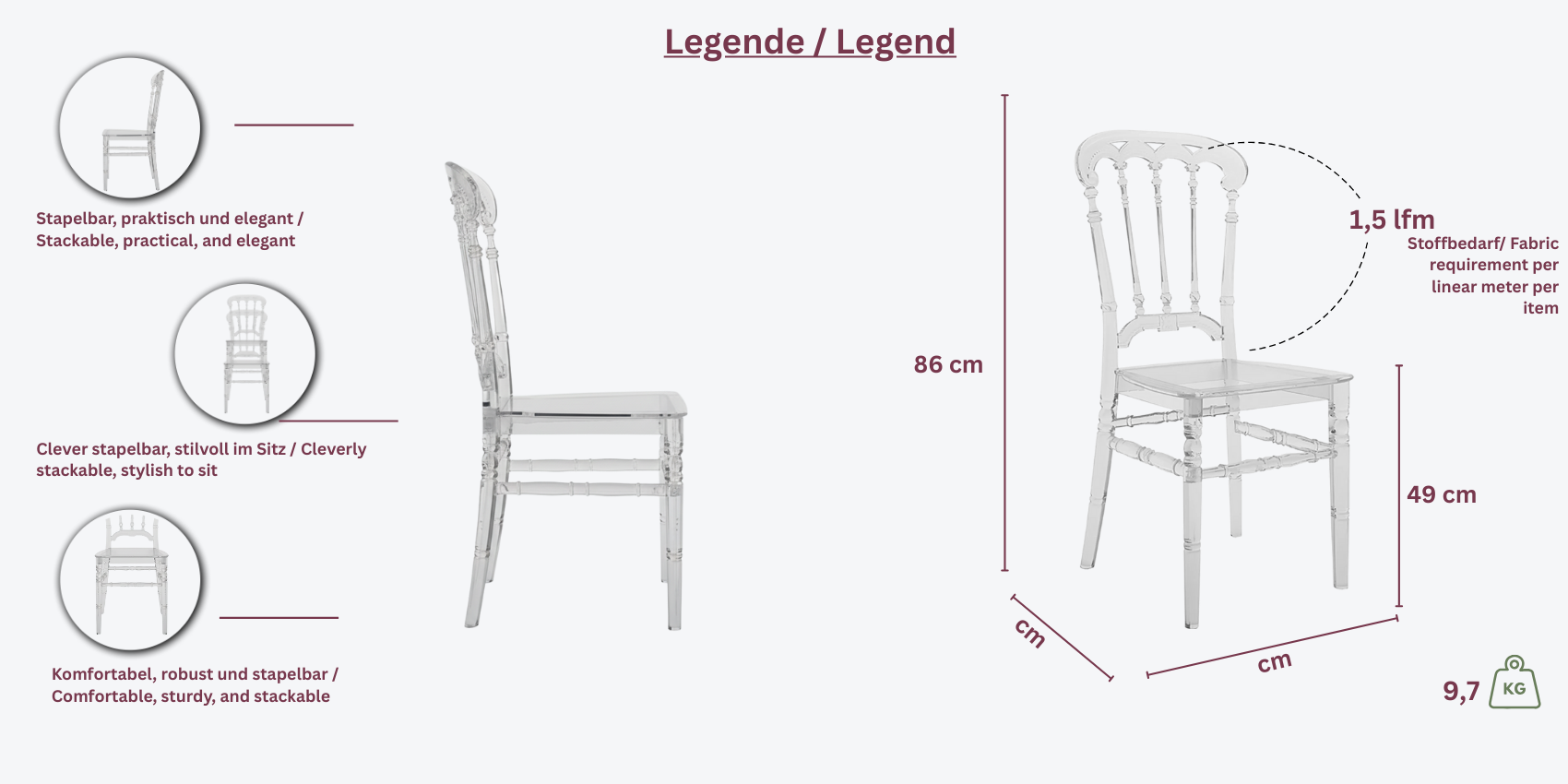- Gestell: Transparentes Polycarbonat in Monoblock-Ausführung. Dieses Material bietet eine hohe Festigkeit und eine klare, elegante Optik, die sich ideal in moderne Veranstaltungsräume einfügt.