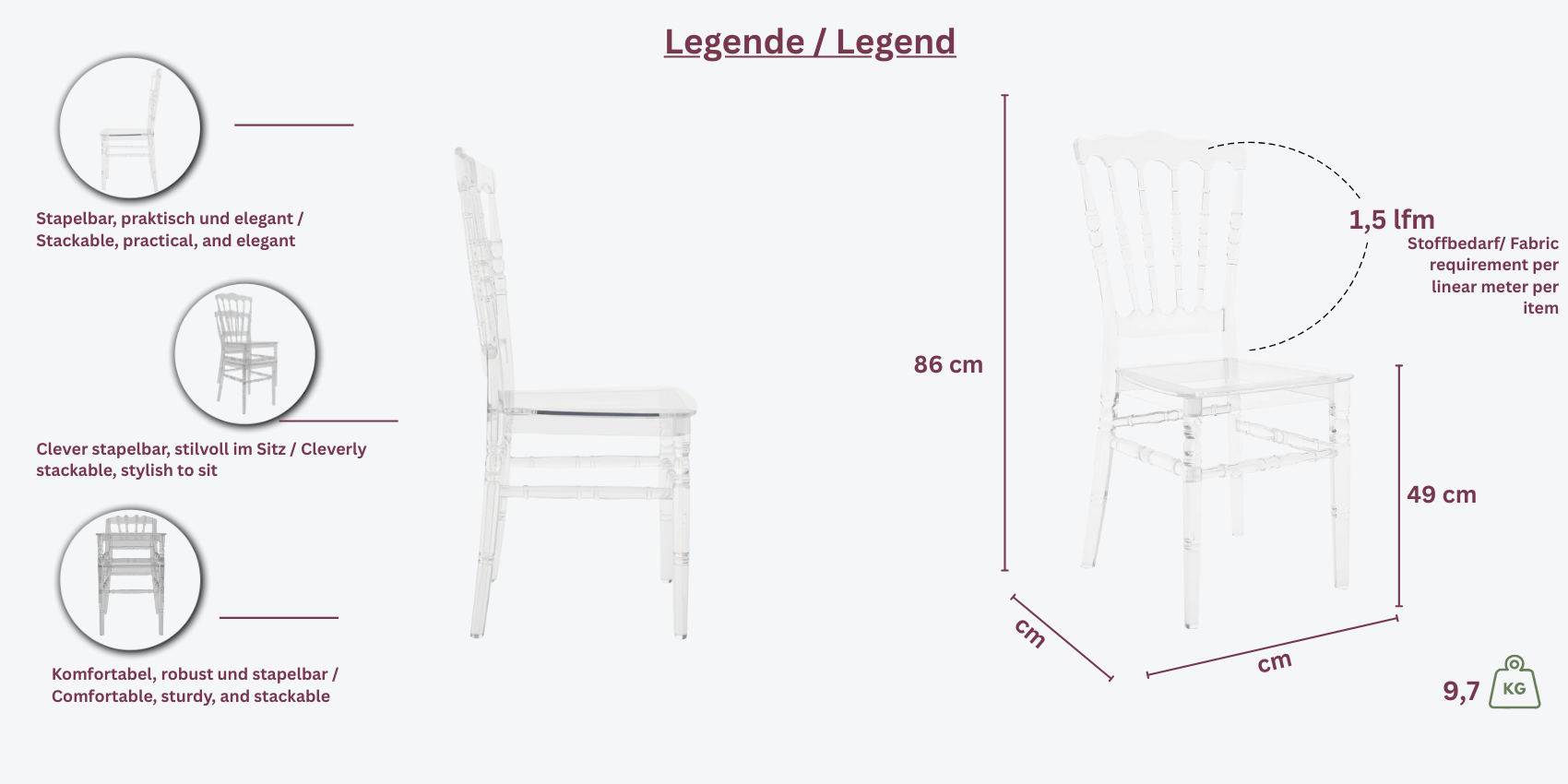 Der Napoleon P.C. Stuhl überzeugt durch sein transparentes Polycarbonat-Gestell, das in einer Monoblock-Ausführung gefertigt wird. Dieses Material bietet nicht nur eine hohe Stabilität, sondern auch eine zeitgemäße Ästhetik, die zu jeder Veranstaltung passt.