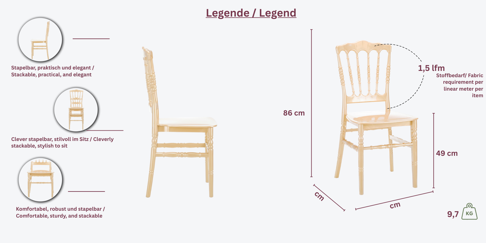 - Elegantes Design: Der Stuhl vereint funktionale Vorteile mit einem stilvollen Erscheinungsbild, ideal für elegante Veranstaltungen.