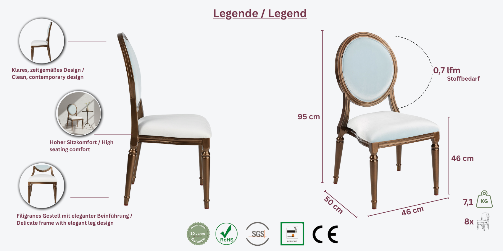 Der Bankettstuhl Renaissance bietet nicht nur Stil, sondern auch hervorragende Stabilität und Komfort. Er ist perfekt für anspruchsvolle Events, bei denen sowohl Design als auch Funktionalität wichtig sind.