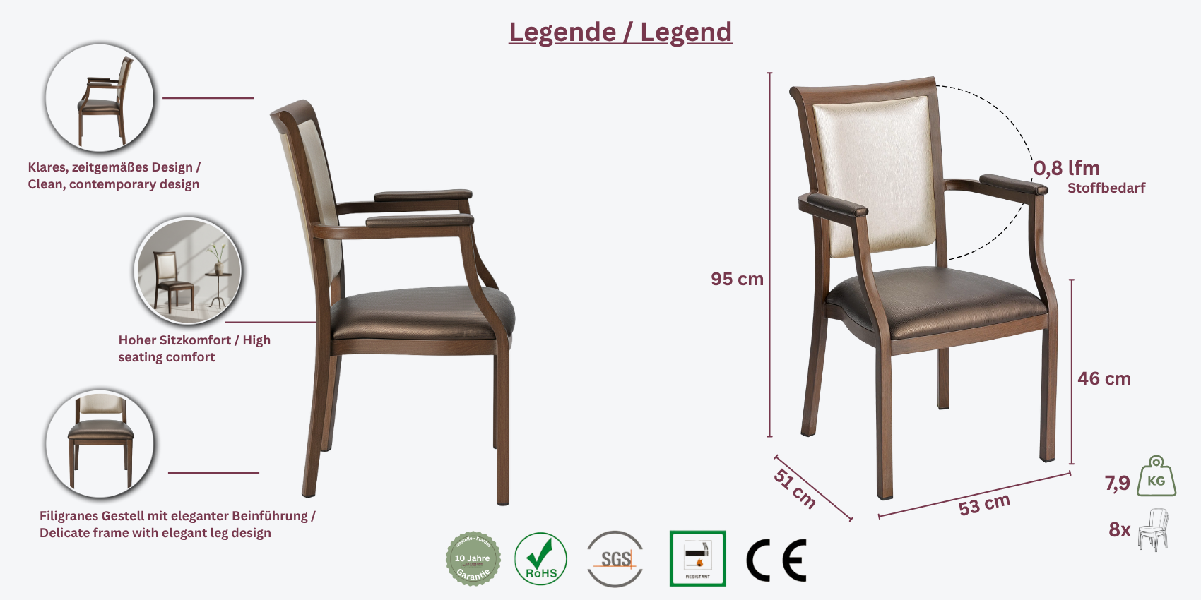 Dieser Stuhl kombiniert elegantes Design mit einer robusten Bauweise. Er bietet neben einem ansprechenden Aussehen auch den zusätzlichen Komfort von Armlehnen, was ihn besonders für lange Veranstaltungen geeignet macht.