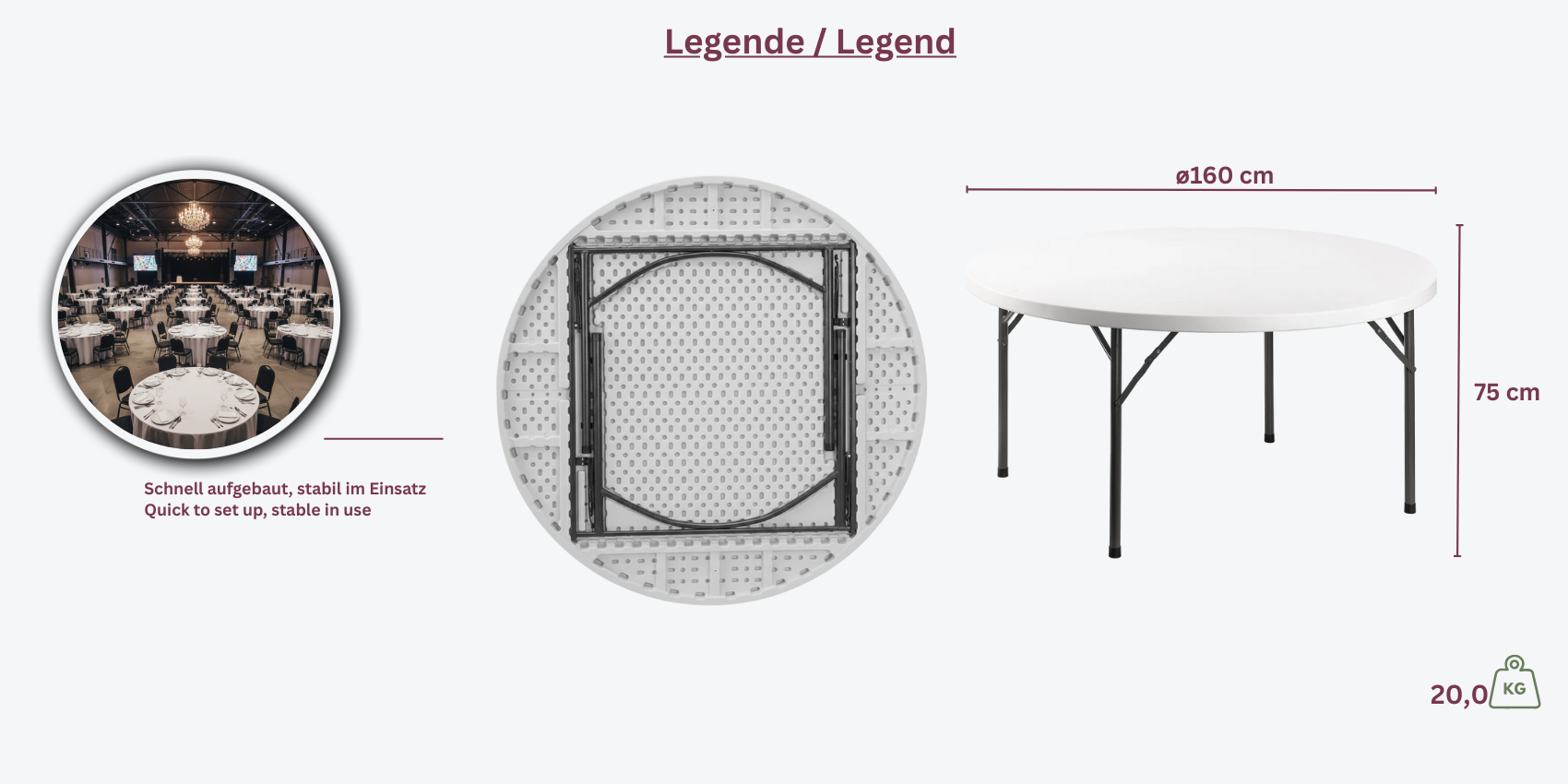 Der Banketttisch Bison in der Größe Ø 160 cm ist besonders robust und ideal für den Einsatz bei großen Veranstaltungen oder Banketten. Mit seinem klappbaren Design und der widerstandsfähigen HDPE-Platte bietet er eine praktische Lösung für alle Eventbedürfnisse.