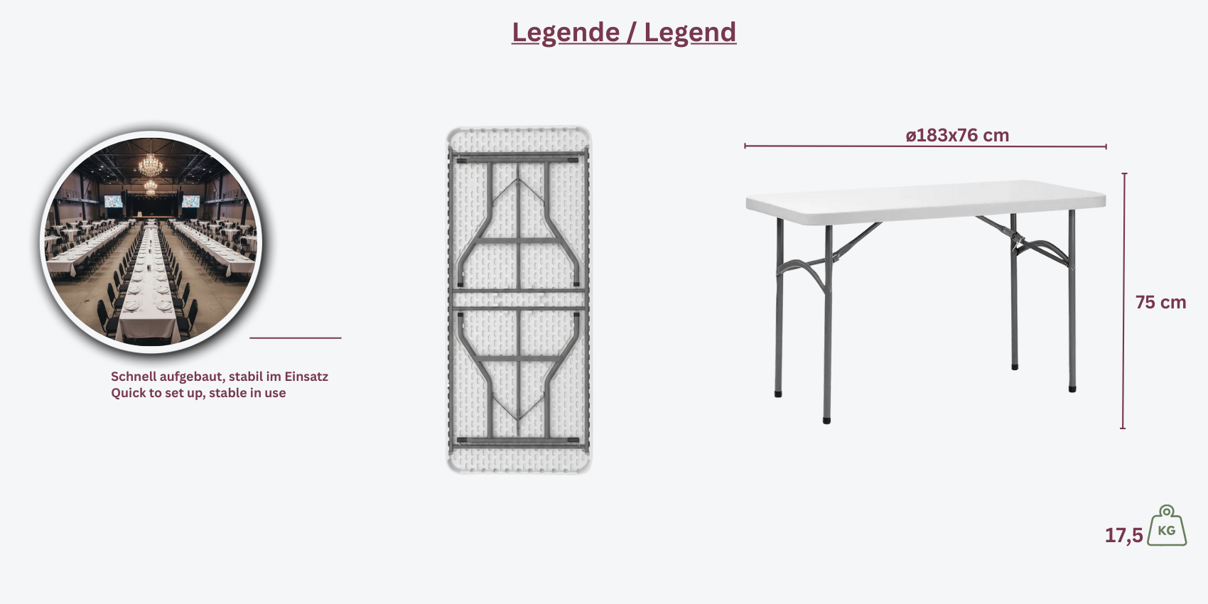 Der Banketttisch Bison in rechteckiger Form (183 x 76 cm) bietet eine robuste, klappbare Lösung für Ihre Event- oder Veranstaltungsbedürfnisse. Mit seinem stabilen Gestell und der strapazierfähigen Platte ist er sowohl für den Innen- als auch den Außeneinsatz geeignet.