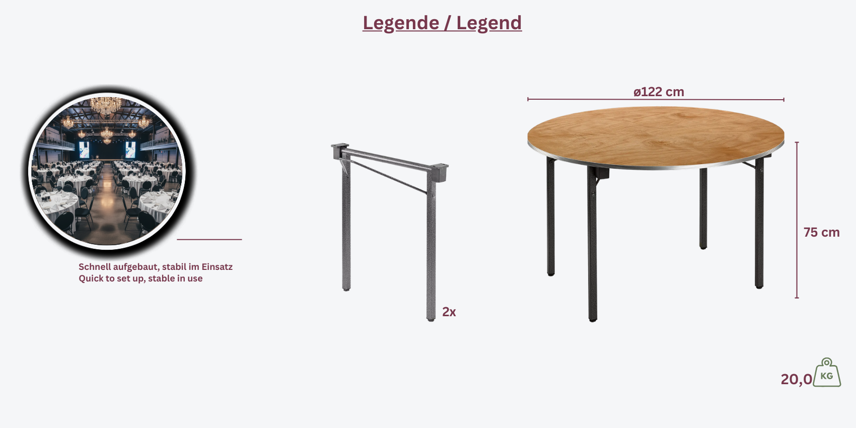 Der Banketttisch Optima Eco bietet eine noch stabilere Bauweise und eignet sich hervorragend für professionelle Veranstaltungen. Mit seinem stabilen Gestell und der Multiplexplatte mit Aluminiumkante ist er besonders robust und pflegeleicht.