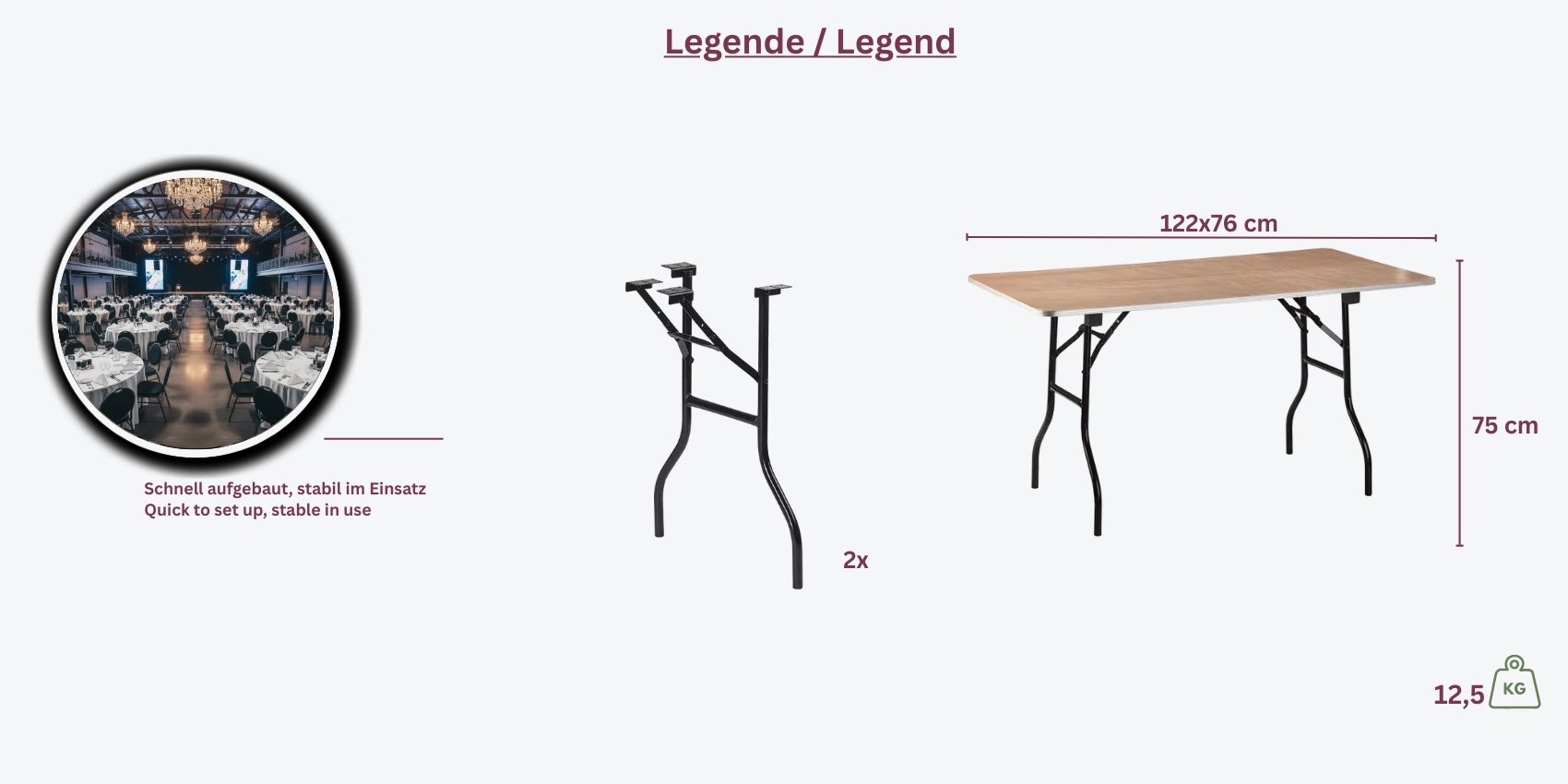 Der Banketttisch Simplex Eco ist ein praktischer, klappbarer Tisch mit einem stabilen Gestell, der ideal für verschiedene Events und Bankette geeignet ist. Mit seiner klappbaren Funktion bietet er eine platzsparende Lösung und kann schnell verstaut werden.