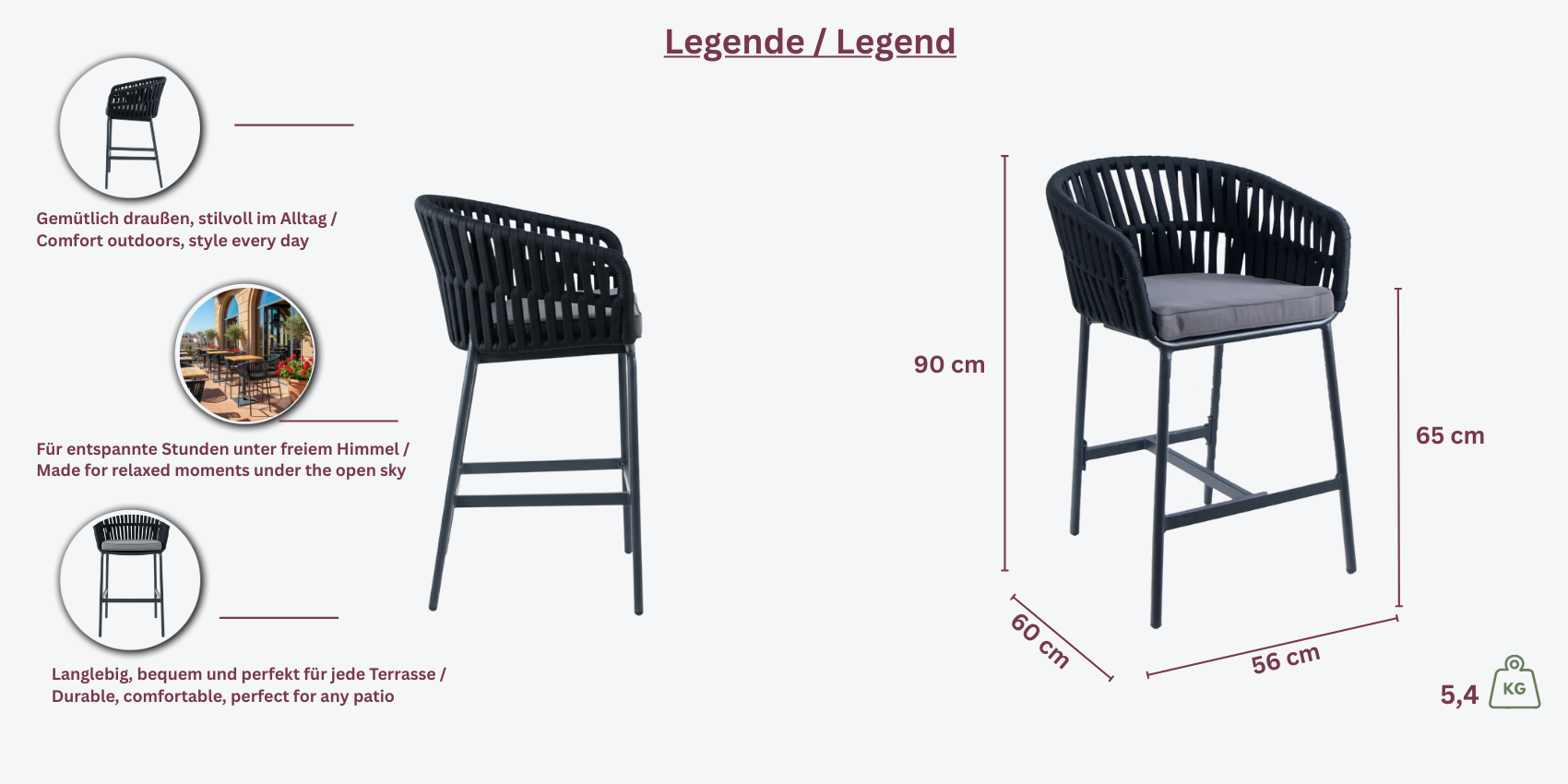 - Sitzhöhe: 65 cm – perfekte Midihöhe für entspanntes Sitzen.