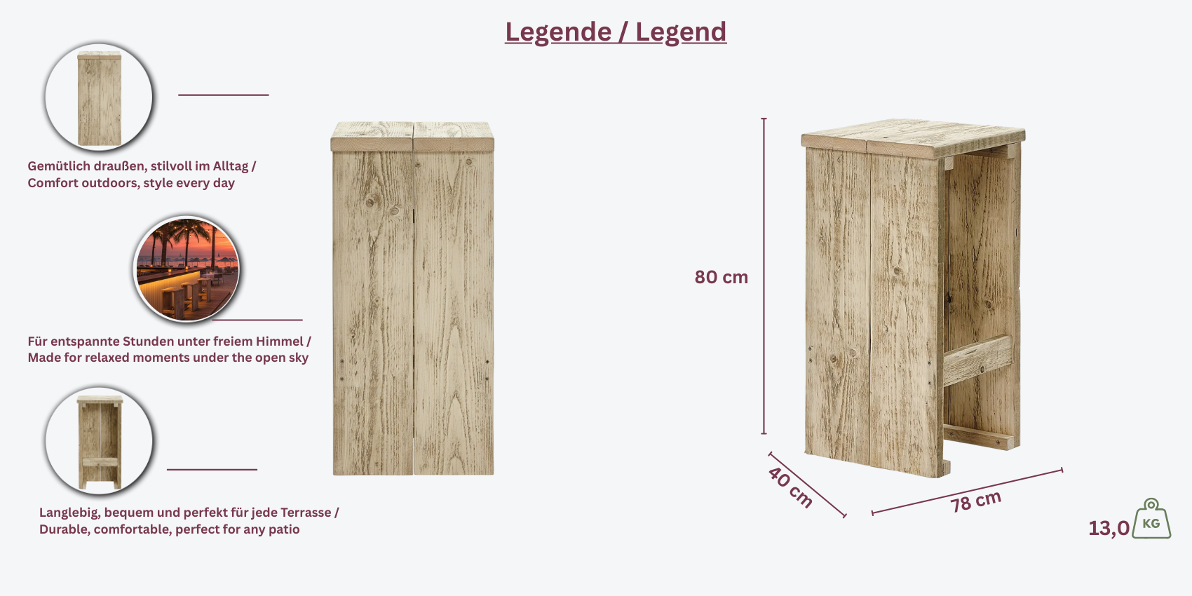 Dieser Hocker ist perfekt für jeden Ort und jede Jahreszeit, ideal für Restaurants, Bars oder Outdoor-Bereiche. Bestellen Sie jetzt den Bauholz Barhocker 1 und viele andere einzigartige Möbelstücke schnell und einfach bei A.B.C. Worldwide!