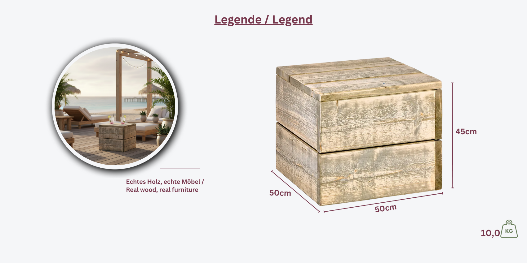 - Robust und stabil: Der Loungetisch ist aus massivem Bauholz gefertigt und widerstandsfähig gegenüber äußeren Einflüssen.