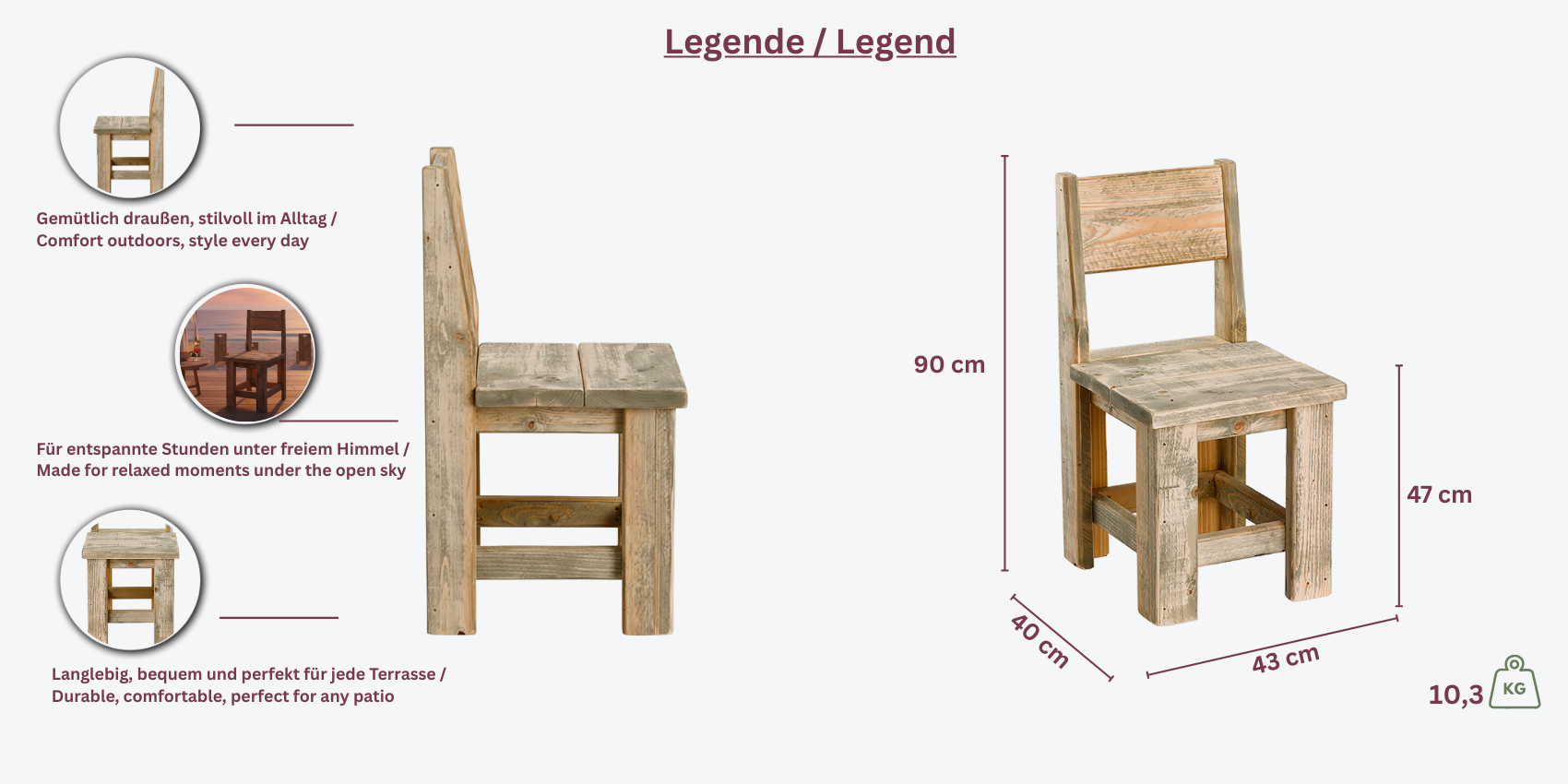 Der Garden Emotions Bauholz Stuhl 2 beeindruckt durch sein auffälliges Bauholz-Design. Gefertigt aus massivem Bauholz, bietet dieser Stuhl sowohl für Innen- als auch Außenbereiche eine stilvolle und praktische Lösung. Er ist UV- und wetterbeständig und in vier attraktiven Farben erhältlich.