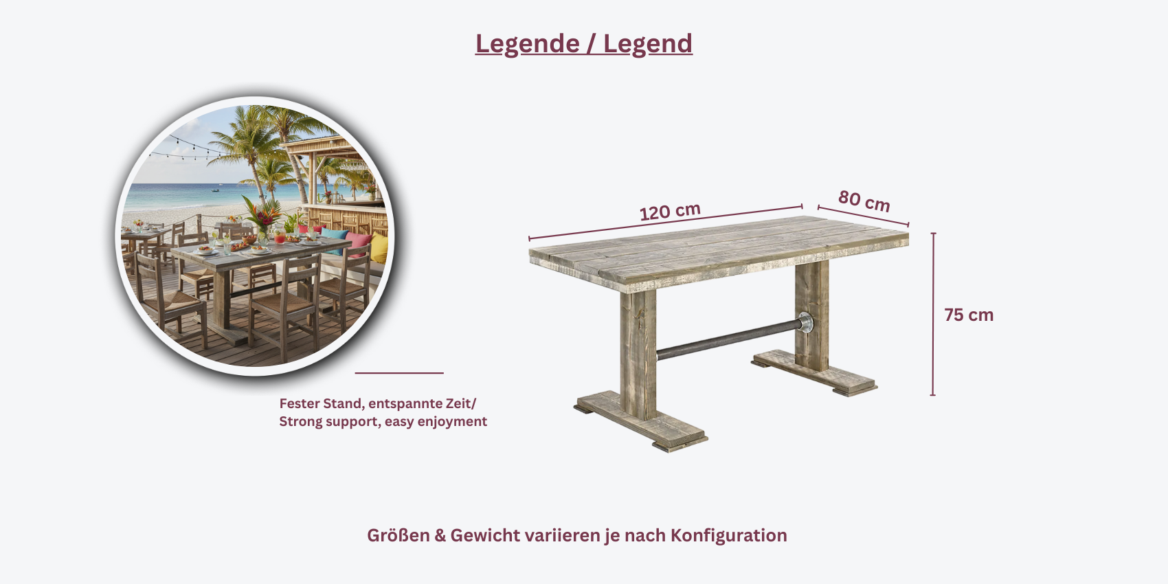 - UV- und wetterbeständig: Der Tisch ist resistent gegen UV-Strahlen und Witterungseinflüsse, wodurch er ideal für den Außeneinsatz geeignet ist.
