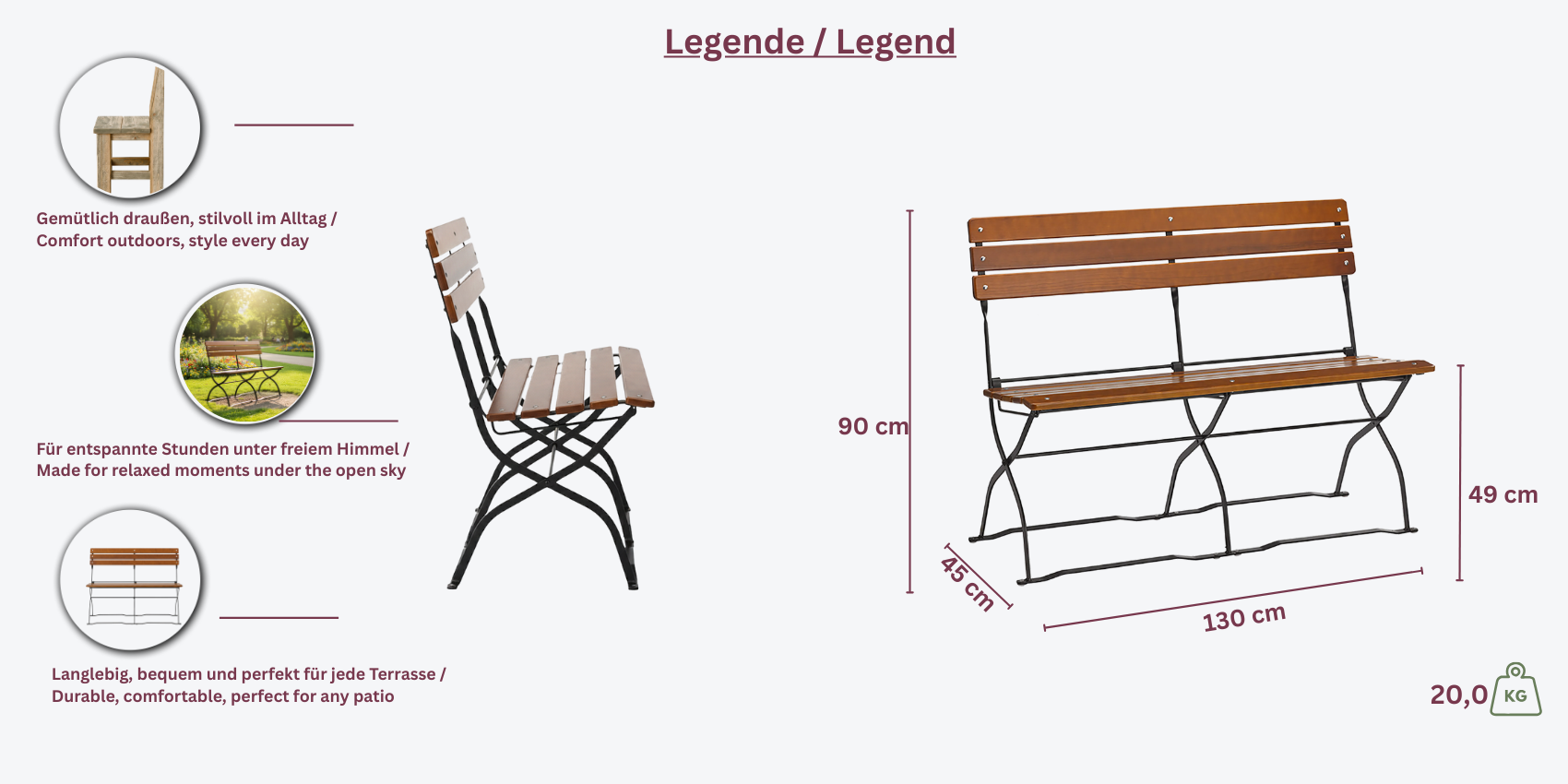 Diese Bank ist ideal für Ihren Garten oder Ihre Gastronomie und bietet Platz für zwei Personen. Das Gestell besteht aus Flachstahl, der entweder feuerverzinkt oder mit Pulverbeschichtung in Grün oder Schwarz erhältlich ist. Der Sitz besteht aus Eschenholzlattung, die mehrfach dickschichtig lasiert wurde. Die Bank ist klappbar und zugleich UV- und wetterbeständig.
