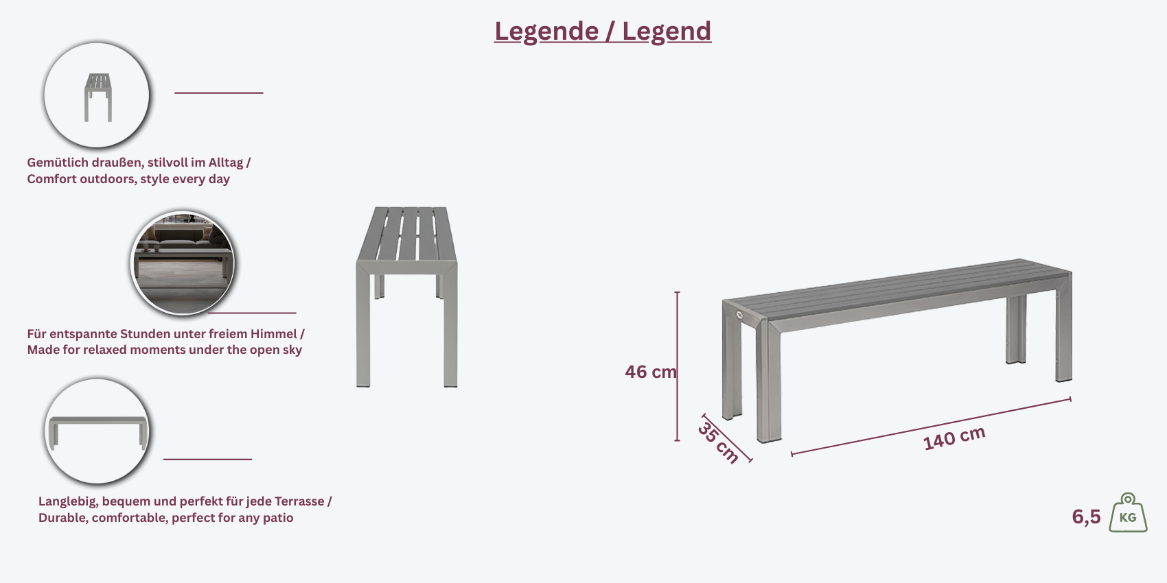 Dank ihrer klaren Linien und der dezenten grauen Farbgebung passt die Sinon Bank perfekt zu verschiedenen Einrichtungsstilen und kann sowohl als Einzelstück als auch in Kombination mit anderen Gartenmöbeln verwendet werden. Sie ist leicht zu reinigen und erfordert nur minimale Pflege, wodurch sie sich ideal für den Einsatz im Freien eignet.