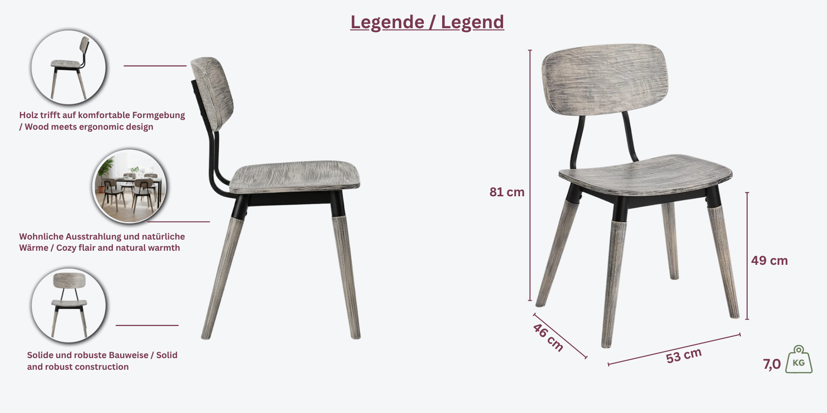 Der Stuhl verfügt über ein Gestell aus hochwertigem Buchenholz, das nach Wunsch in verschiedenen Beiztönen wie Wenge, Nussbaum oder Kirsche veredelt werden kann. Zusätzlich sorgen Metallverstrebungen für zusätzliche Stabilität. Der Sitz besteht aus strapazierfähigem Sperrholz, was den Stuhl besonders langlebig macht.