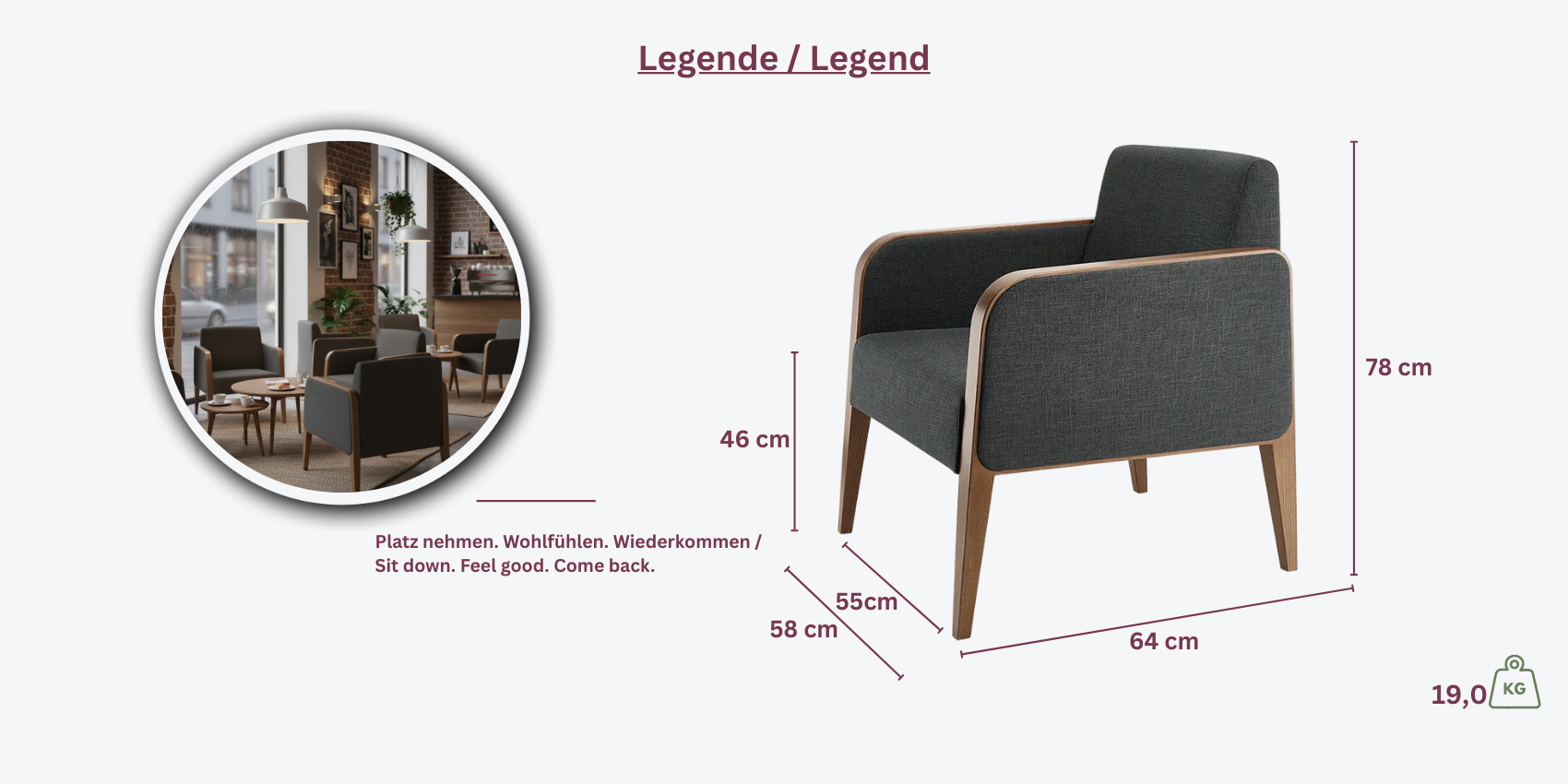 Kompakter Loungesessel mit Buchenholzgestell, gebeizt nach Wahl. Bezug in Kunstleder oder Stoff – ideal für Objekt- und Loungebereiche.
