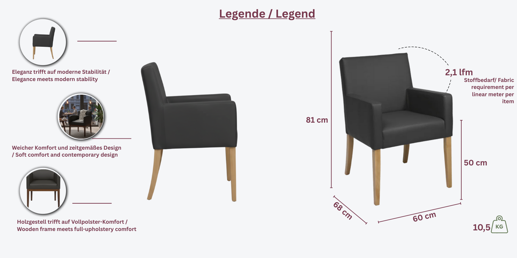 Der Toledo Sessel besticht durch sein robustes Gestell aus Buchen- oder Eichenholz, das nach Wunsch in Nussbaum, Eiche oder Wenge gebeizt werden kann. Der Sitz und Rücken sind in Kunstleder oder Bezugsstoff verfügbar, um Ihren spezifischen Designvorstellungen gerecht zu werden. Besonders hervorzuheben ist die Nosag-Federung, die für außergewöhnlichen Komfort sorgt. Zusätzlich können Sie den Sessel mit oder ohne Handeingriff in der Rückenlehne bestellen.