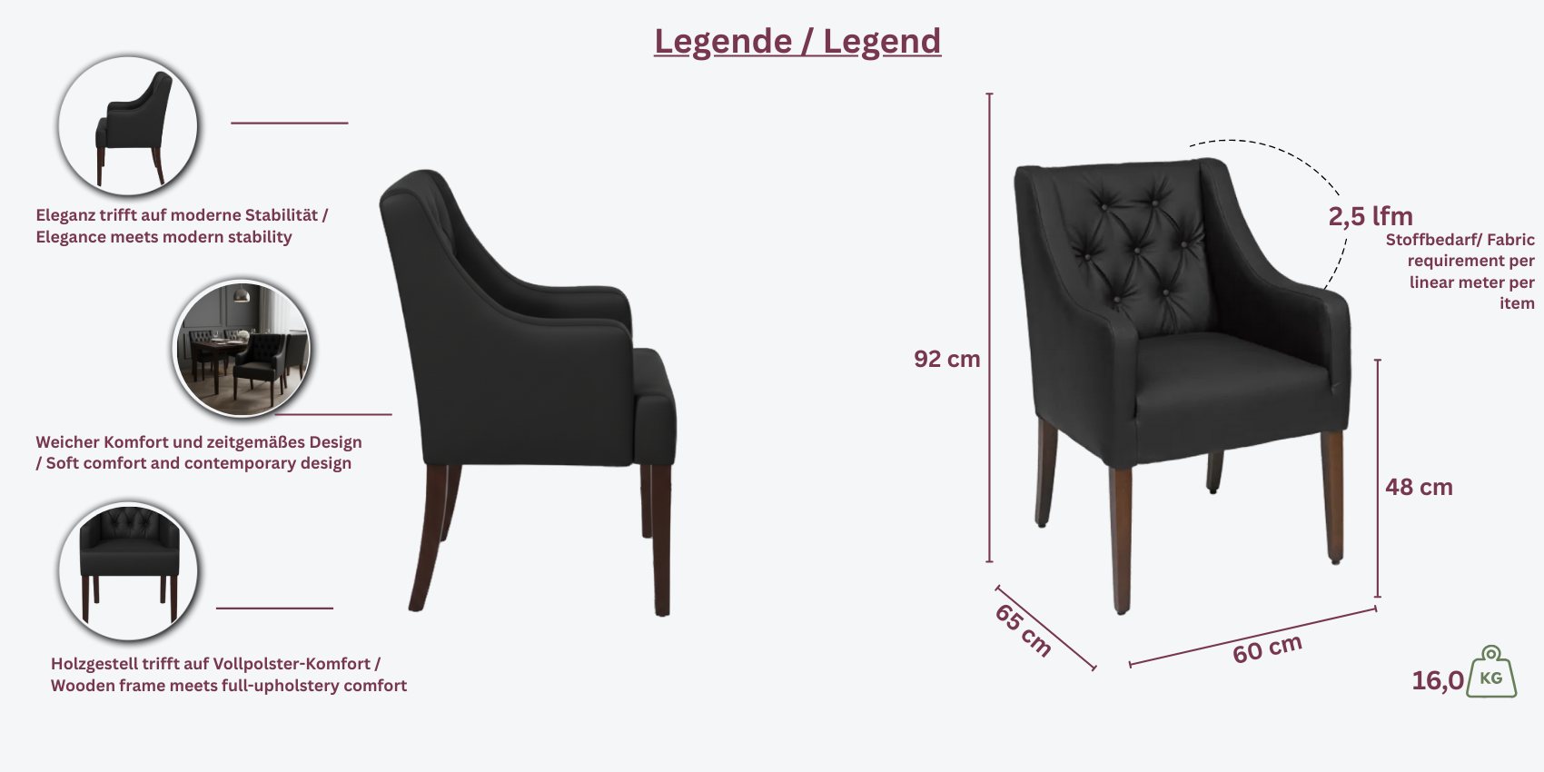 Der Torrance Sessel kommt mit einem Gestell aus Buchen- oder Eichenholz, das nach Wunsch in Farben wie Nussbaum, Eiche oder Wenge gebeizt werden kann. Der Sitz und Rücken sind in Kunstleder, Bezugsstoff oder Echtleder erhältlich, was eine hohe Anpassungsfähigkeit an verschiedene Designkonzepte bietet. Besondere Merkmale sind die Knopfheftung mit gelegten Falten sowie die Nosag-Federung, die zusätzlichen Komfort und Langlebigkeit gewährleisten.