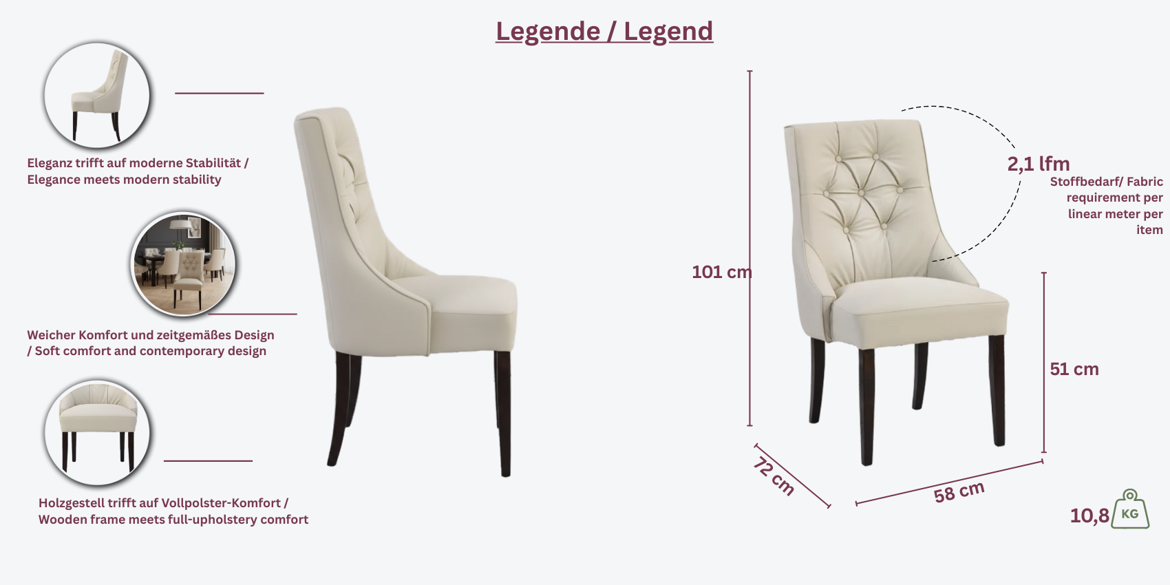 - Gestell: Buchen- oder Eichenholz, gebeizt nach Wunsch (z.B. Nussbaum, Eiche oder Wenge)