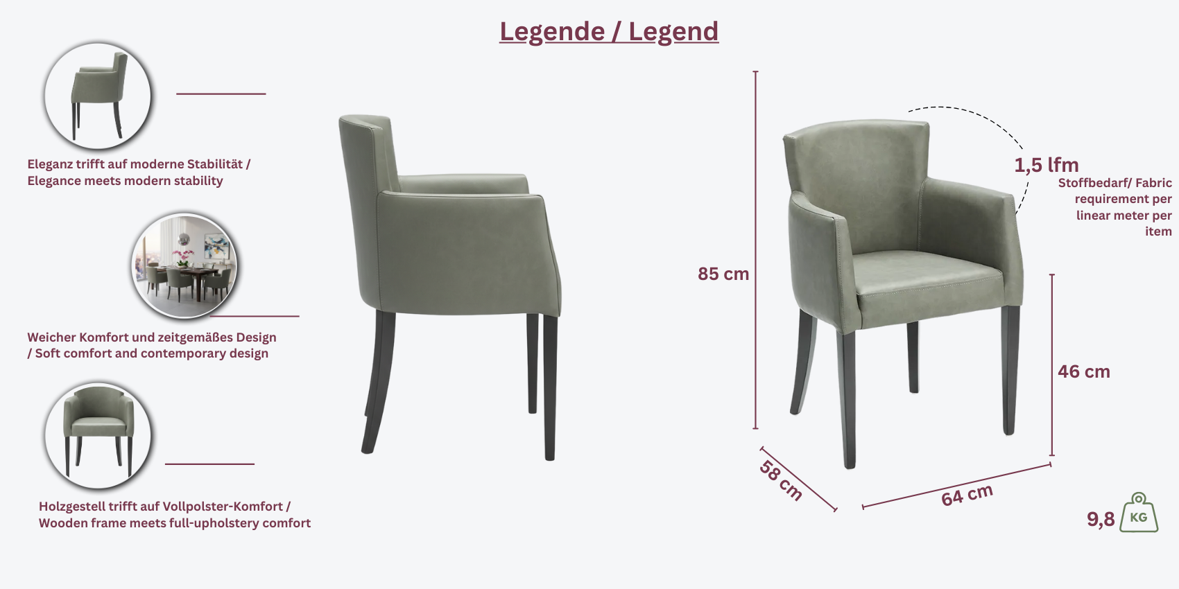 Wählen Sie Ihr bevorzugtes Gestell aus Buchenholz, gebeizt nach Wunsch, und kombinieren Sie es mit Kunstleder, Bezugsstoff oder Echtleder