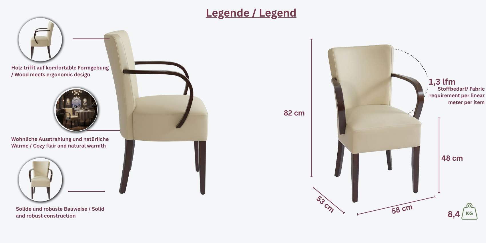 Dieser Stuhl bietet ein erstklassiges Design mit runden Armlehnen und ein Gestell aus Buchenholz, das nach Wunsch in Farben wie Nussbaum, Eiche oder Wenge gebeizt werden kann. Die Sitz- und Rückenflächen sind in Kunstleder, Bezugsstoff oder Echtleder erhältlich, um den individuellen Geschmack und die Anforderungen zu erfüllen.