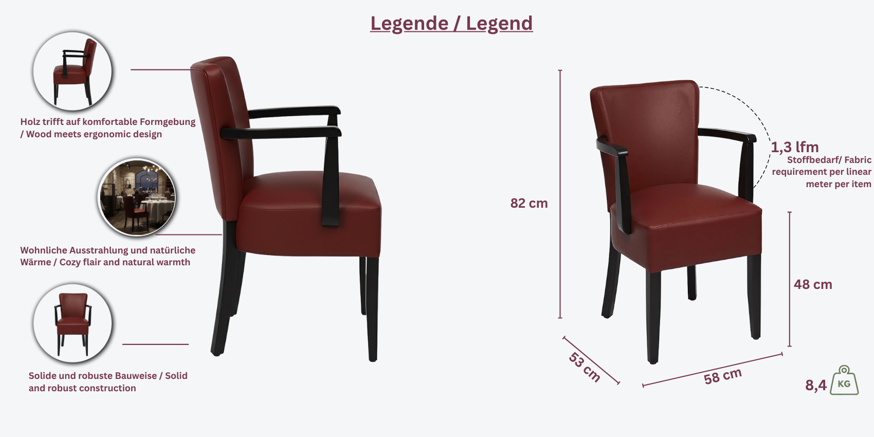 Dieser Stuhl zeichnet sich durch seine eckigen Armlehnen aus und bietet ein robustes Buchenholzgestell, das nach Wunsch in verschiedenen Farben wie Nussbaum, Eiche oder Wenge gebeizt werden kann. Die Sitz- und Rückenflächen sind in Kunstleder, Bezugsstoff oder Echtleder erhältlich, um unterschiedlichen Stilrichtungen und Anforderungen gerecht zu werden.