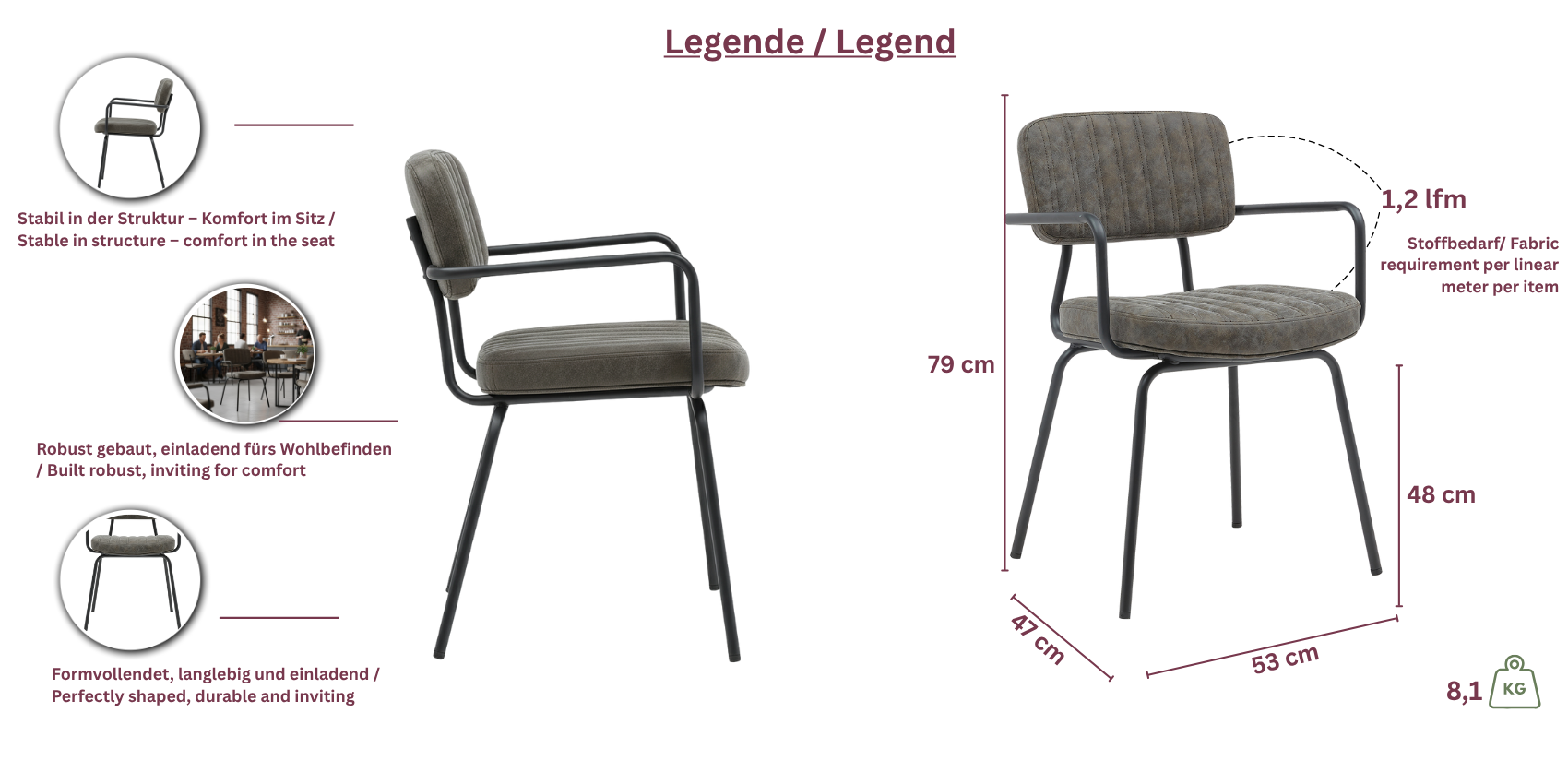Das robuste Stahlgestell verleiht dem Stuhl Stabilität und eine moderne Ausstrahlung. Die hochwertige Polsterung aus dunkelgrauem PU-Leder sorgt für optimalen Sitzkomfort und unterstützt eine ergonomische Sitzhaltung.