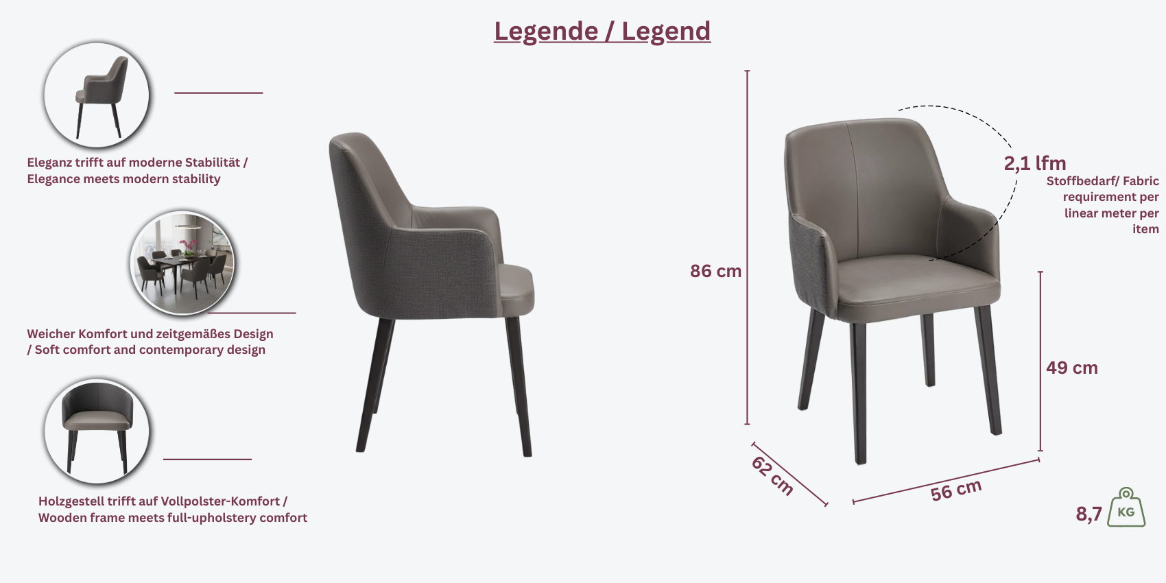 • Gestell: Buchen- oder Eichenholz, gebeizt nach Wunsch (z.B. Nussbaum, Eiche oder Wenge)