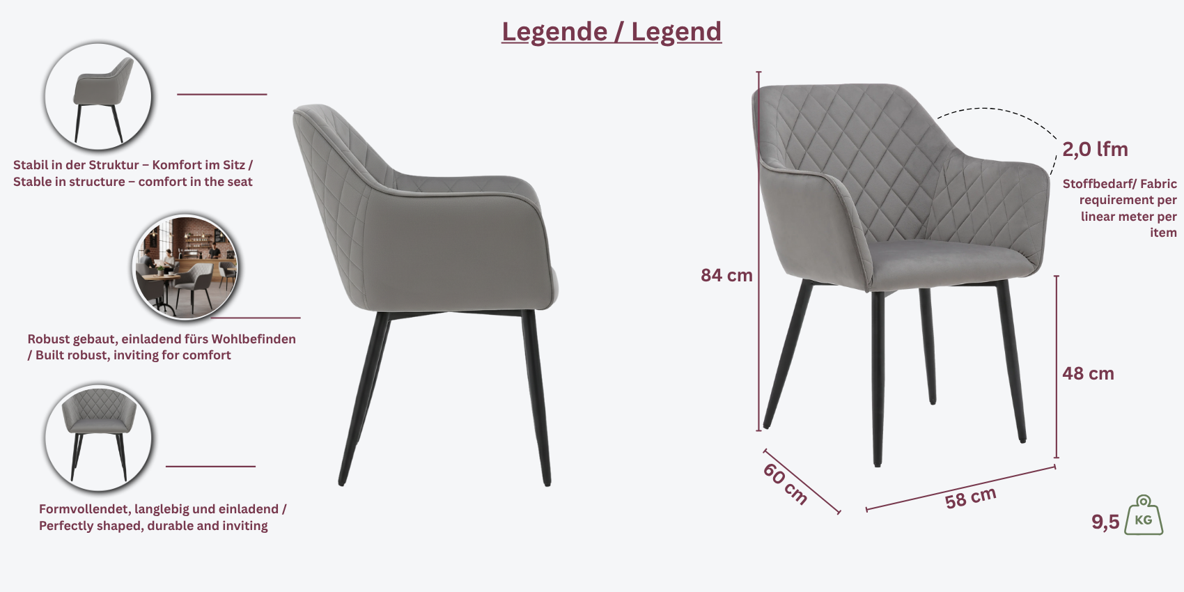 - Sitz/Rücken: Hochwertiger Bezugsstoff in dunklem Grau mit eleganter Rautensteppung