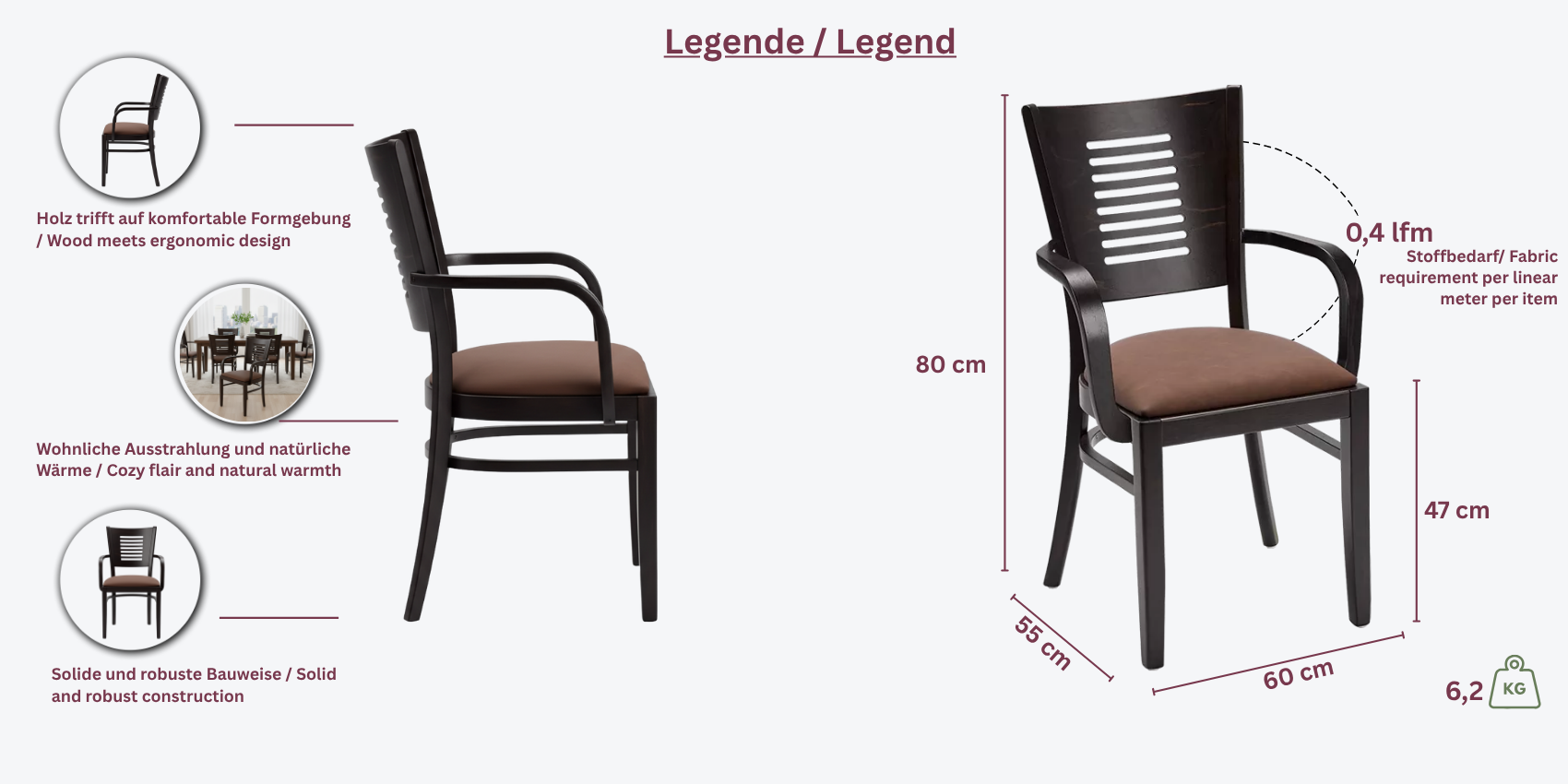 Der Restaurantstuhl Lana AL verbindet elegantes Design mit hoher Flexibilität. Das Gestell aus Buchenholz kann nach Wunsch gebeizt werden, z. B. in Nussbaum, Eiche oder Wenge, und sorgt für Stabilität und hochwertige Optik. Der Sitz ist wahlweise mit Bezugsstoff oder Kunstleder verfügbar und bietet somit individuellen Komfort und Anpassungsmöglichkeiten an jedes Ambiente.