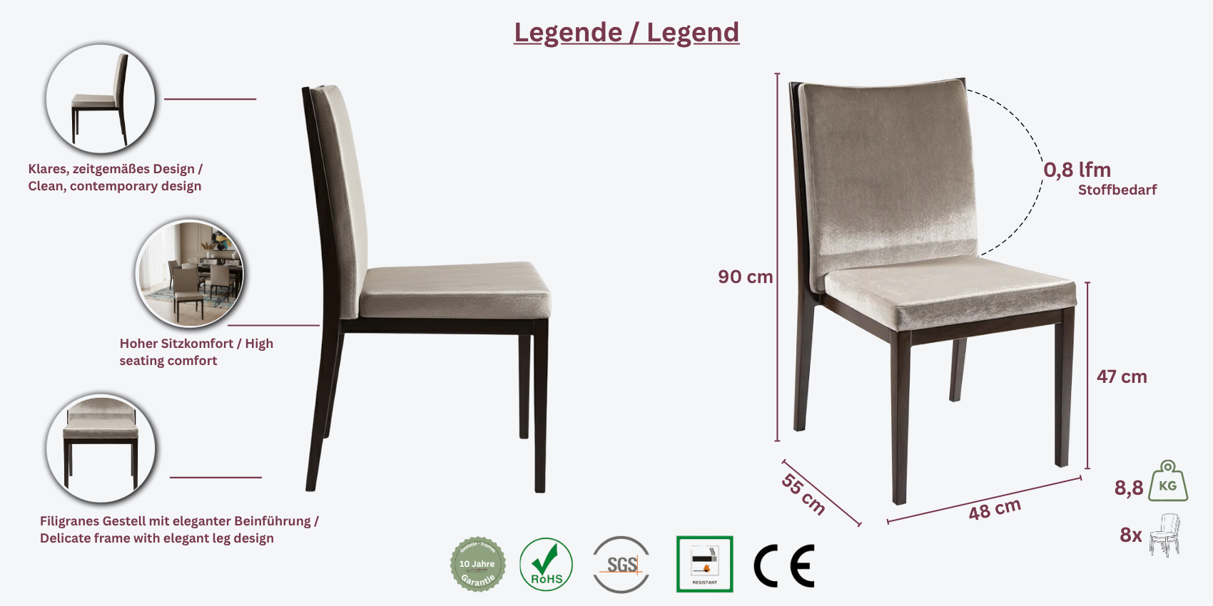- Sitz/Rücken: Verfügbar in Bezugsstoff oder Kunstleder, um verschiedenen Anforderungen an Komfort und Pflegeleichtigkeit gerecht zu werden.