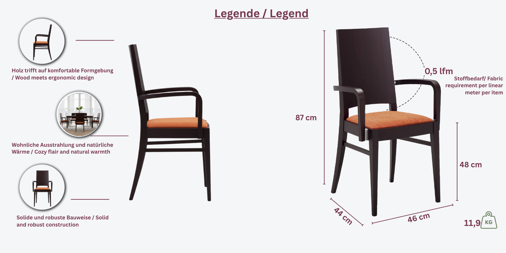 Der Finola AL-Stuhl zeichnet sich durch ein hochwertiges Buchenholzgestell aus, das nach Wunsch in verschiedenen Beiztönen wie Nussbaum, Eiche oder Wenge erhältlich ist. Die Sitz- und Rückenflächen sind in Kunstleder, Bezugsstoff oder Echtleder wählbar, und die integrierten Armlehnen bieten zusätzlichen Komfort für eine entspannte Sitzposition.
