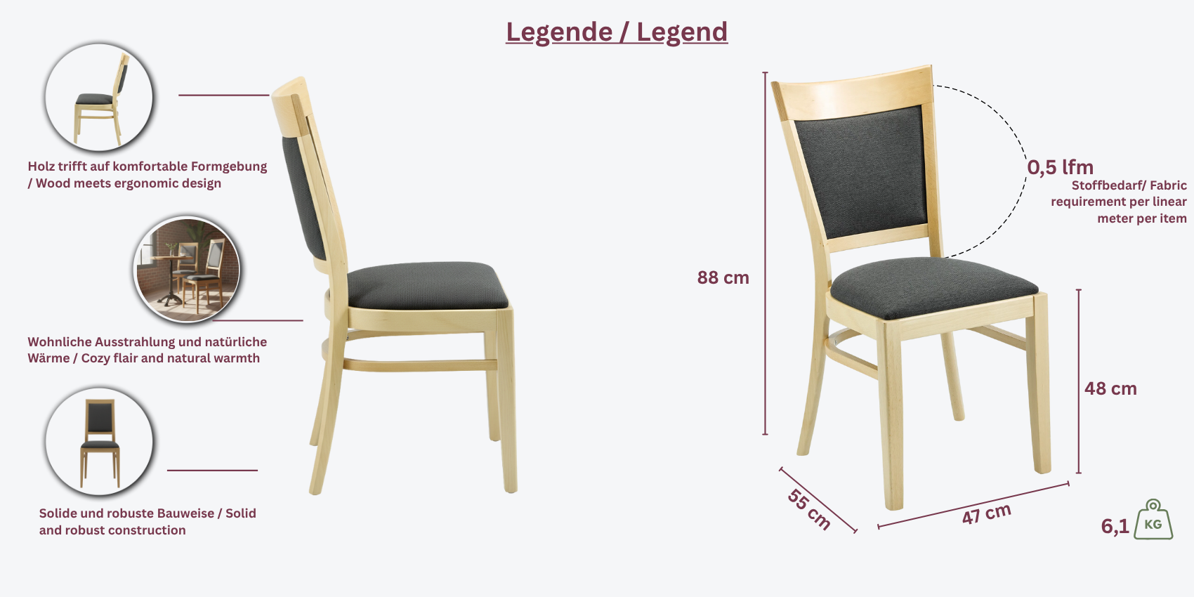 Der Stuhl hat ein Gestell aus Buchenholz, das nach Wunsch in verschiedenen Beiztönen wie Nussbaum, Eiche oder Wenge gefertigt werden kann. Der Sitz und Rücken sind in Kunstleder, Bezugsstoff oder Echtleder erhältlich, um den individuellen Bedürfnissen und dem Design des Raumes gerecht zu werden.