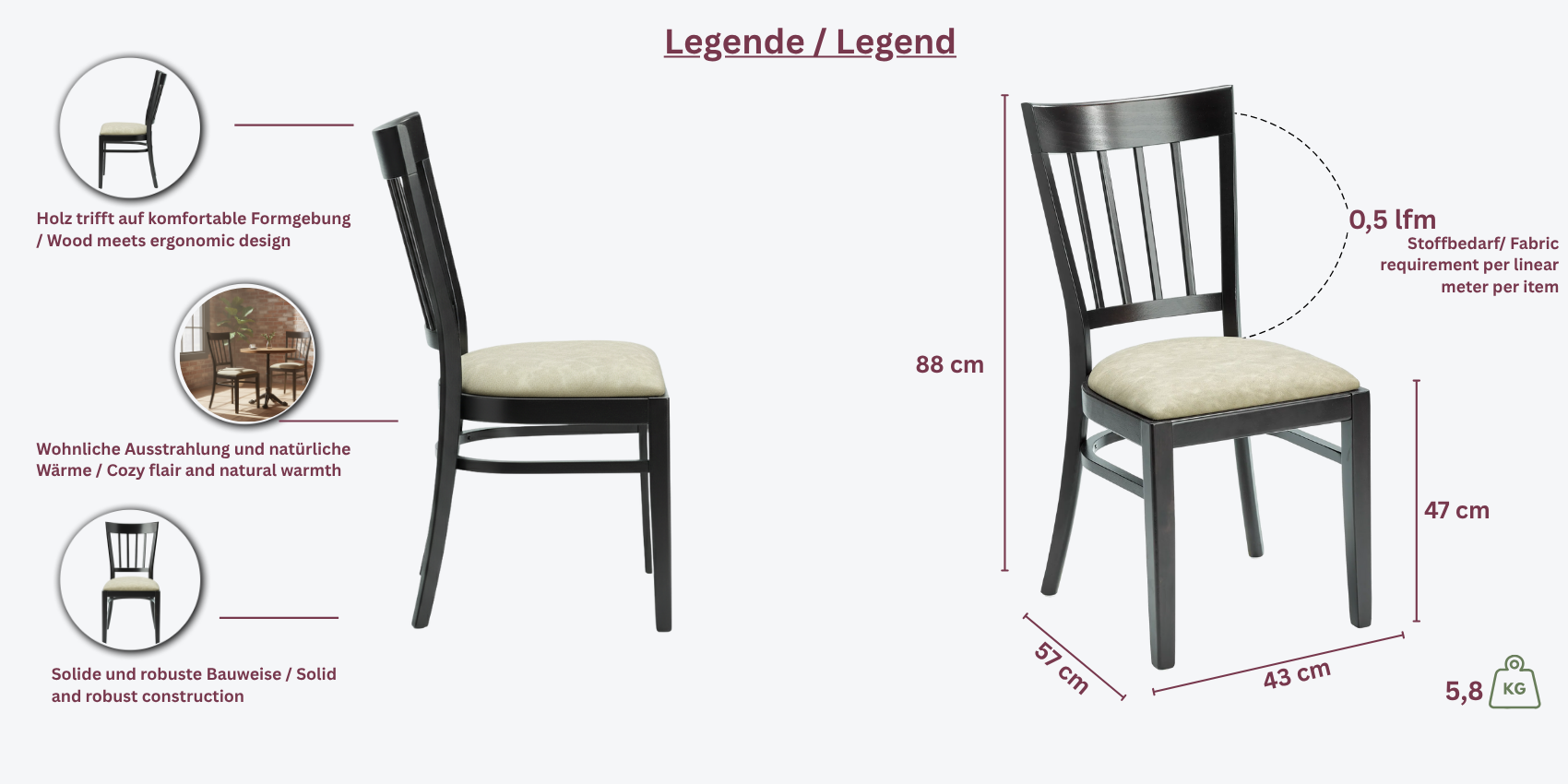 Der Stuhl hat ein robustes Gestell aus Buchenholz, das nach Wunsch in verschiedenen Farben gebeizt werden kann, darunter Nussbaum, Eiche oder Wenge. Der Sitz kann in Bezugsstoff oder Kunstleder nach Wahl gefertigt werden, um sowohl Komfort als auch Stil zu gewährleisten.