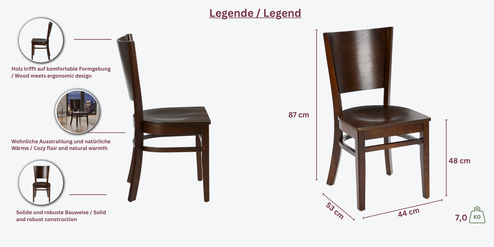Der Stuhl bietet eine Kombination aus robustem Buchenholz-Gestell und einem komfortablen Multiplex-Sitz, ideal für den Einsatz in Restaurants und Cafés.