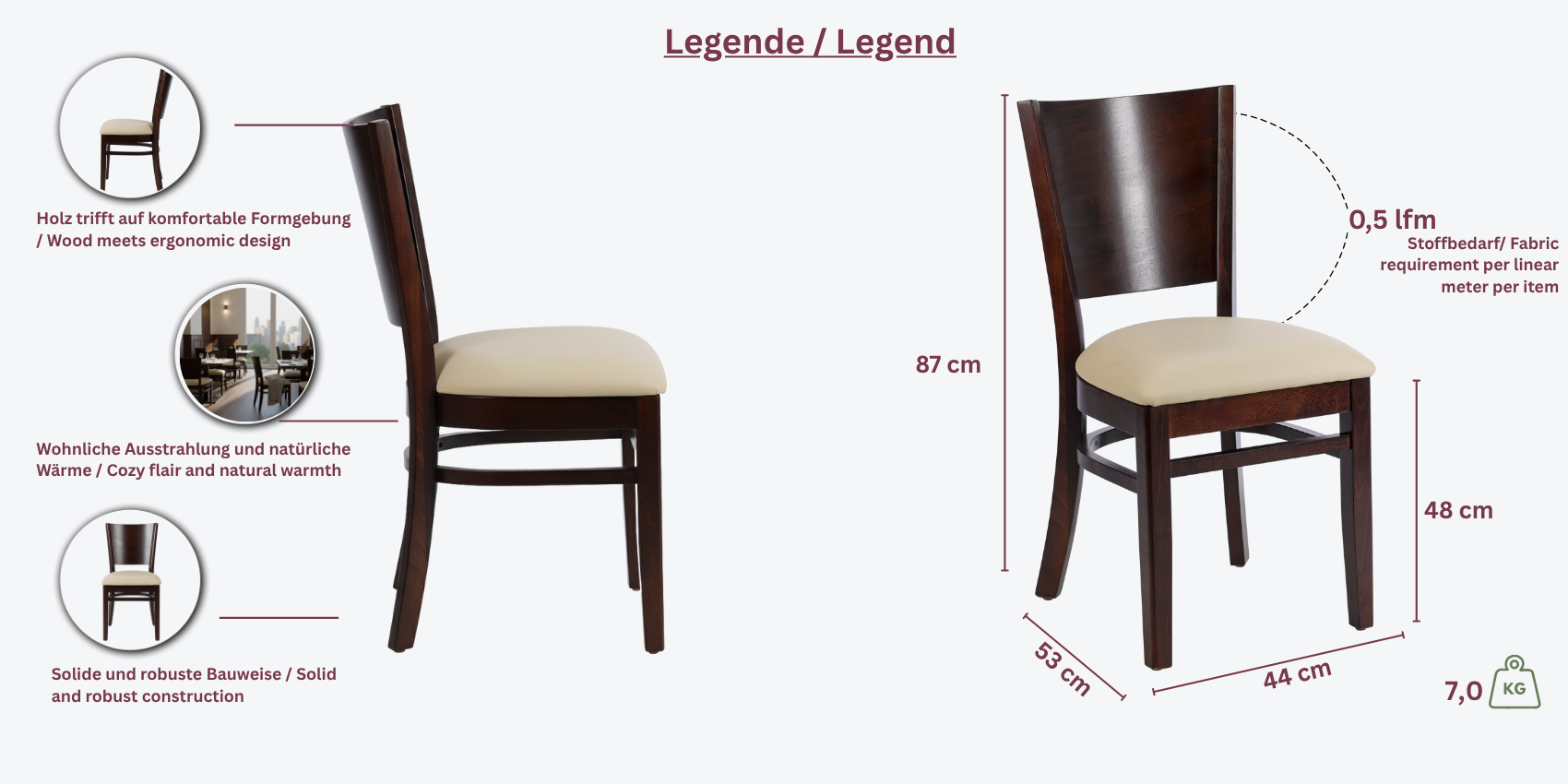 Restaurantstuhl Lynn mit Buchenholzgestell nach Wunsch, in Nussbaum Dunkel direkt ab Lager lieferbar, Sitzoptionen: Kunstleder, Echtleder oder Bezugsstoff