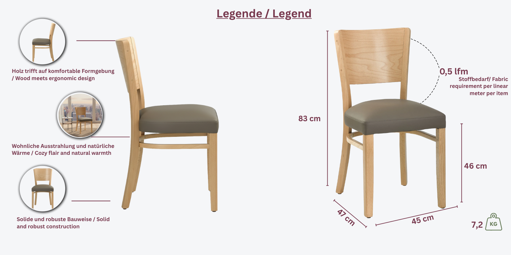 Der Stuhl verfügt über ein Gestell aus robustem Buchenholz, das nach Kundenwunsch in Farben wie Nussbaum, Eiche oder Wenge gebeizt werden kann. Der Sitz und die Rückenlehne bieten Komfort und sind mit Kunstleder, Bezugsstoff oder Echtleder nach Wahl bezogen, um den Raum perfekt abzurunden.