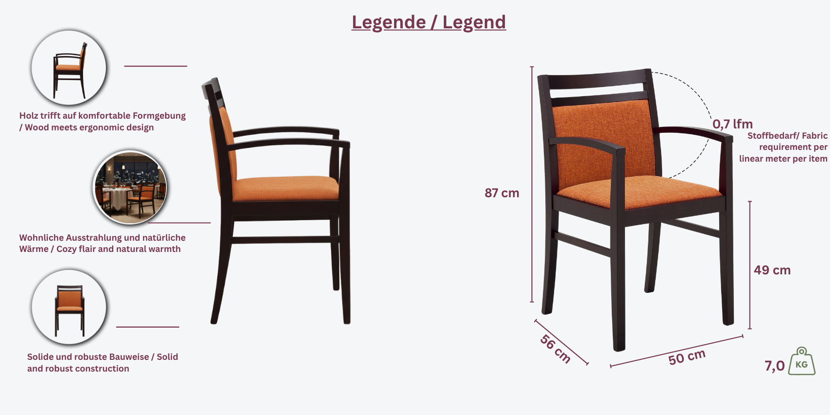 Der Monica AL-Stuhl verfügt über ein robustes Buchenholzgestell, das in verschiedenen Beiztönen wie Nussbaum, Eiche oder Wenge erhältlich ist. Die Sitz- und Rückenflächen können individuell mit Kunstleder, Bezugsstoff oder Echtleder gestaltet werden. Die Armlehnen bieten zusätzlichen Komfort und machen den Stuhl zu einer eleganten Wahl für jedes Restaurant oder Café.