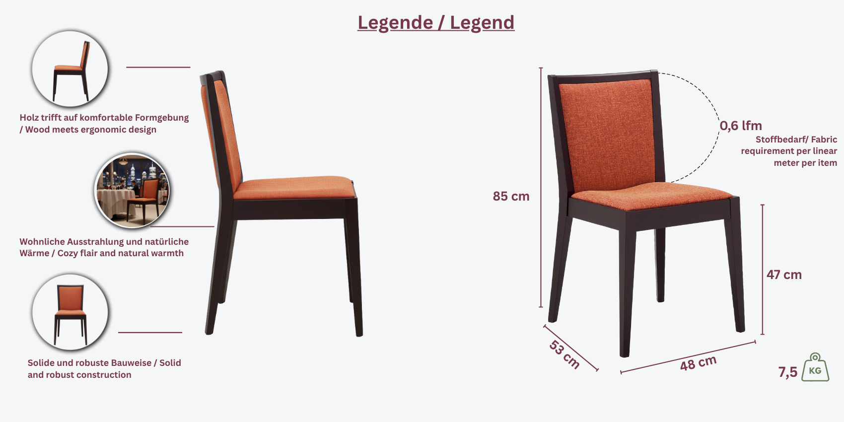 Der Raffaela-Stuhl bietet ein anpassbares Design mit einem stabilen Buchenholzgestell, das in verschiedenen Beiztönen wie Nussbaum, Eiche oder Wenge erhältlich ist. Die Sitz- und Rückenflächen können nach Ihren Wünschen mit Kunstleder, Bezugsstoff oder Echtleder bezogen werden.