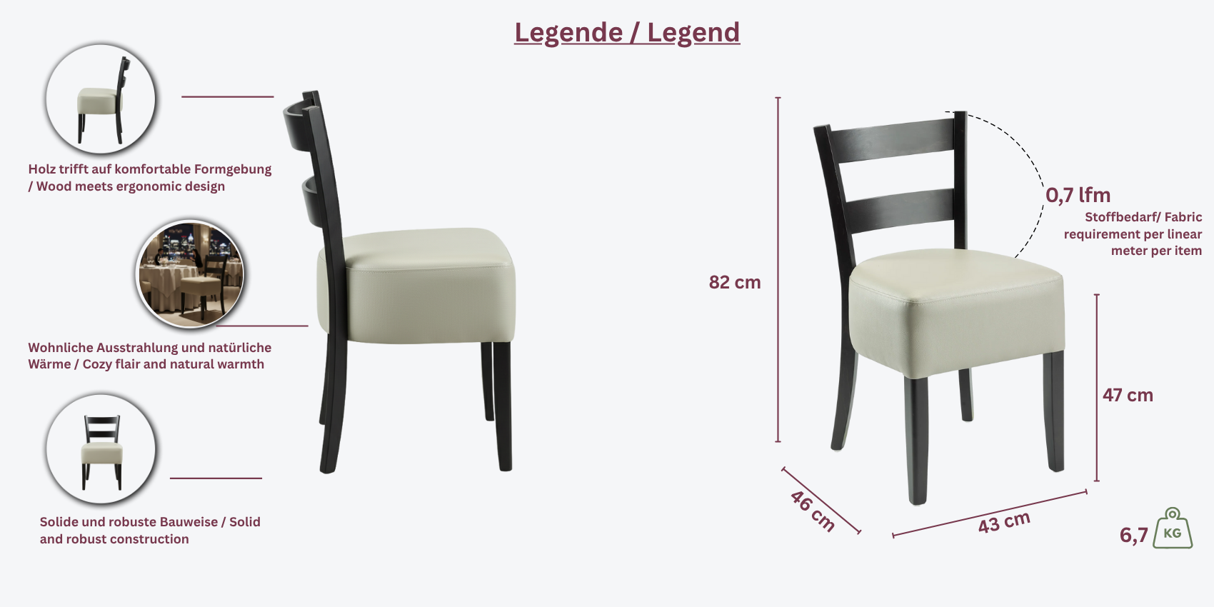 Der Stuhl verfügt über ein Gestell aus Buchenholz, das in verschiedenen Beiztönen erhältlich ist. Der Sitz und Rücken sind in Kunstleder oder Bezugsstoff erhältlich, sodass Sie das Design nach Ihren Wünschen anpassen können.