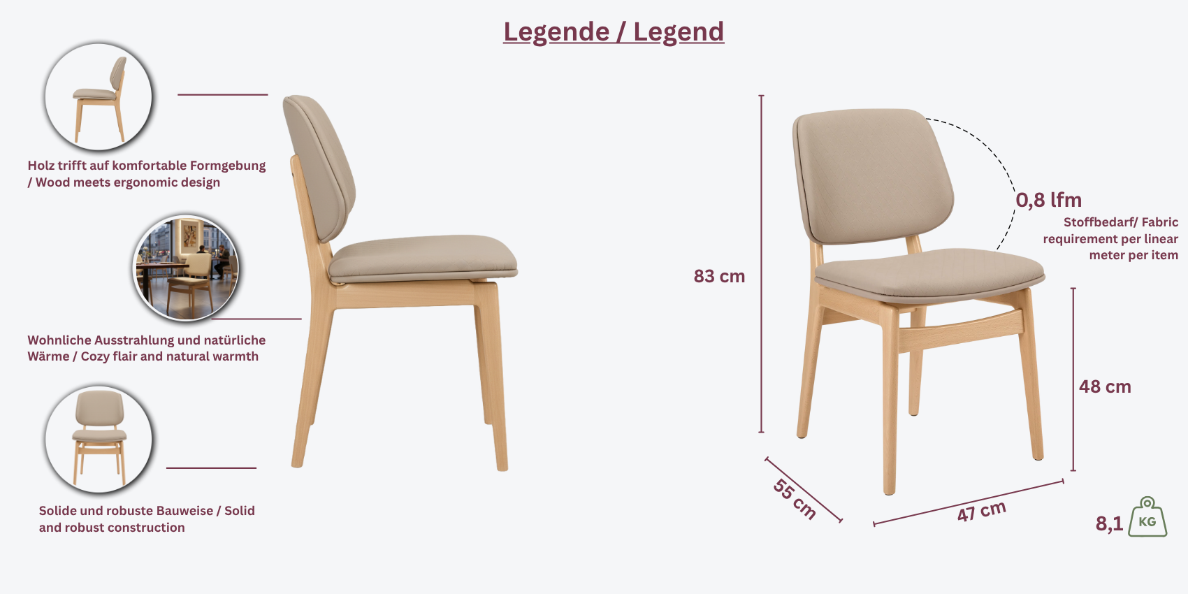 Das Gestell besteht aus robustem Buchenholz und kann auf Wunsch in verschiedenen Beizungen wie Nussbaum, Eiche oder Wenge bestellt werden. Der Sitz kann individuell mit Bezugsstoff oder Kunstleder in verschiedenen Farben und Mustern gestaltet werden, je nach Ihren Vorlieben.