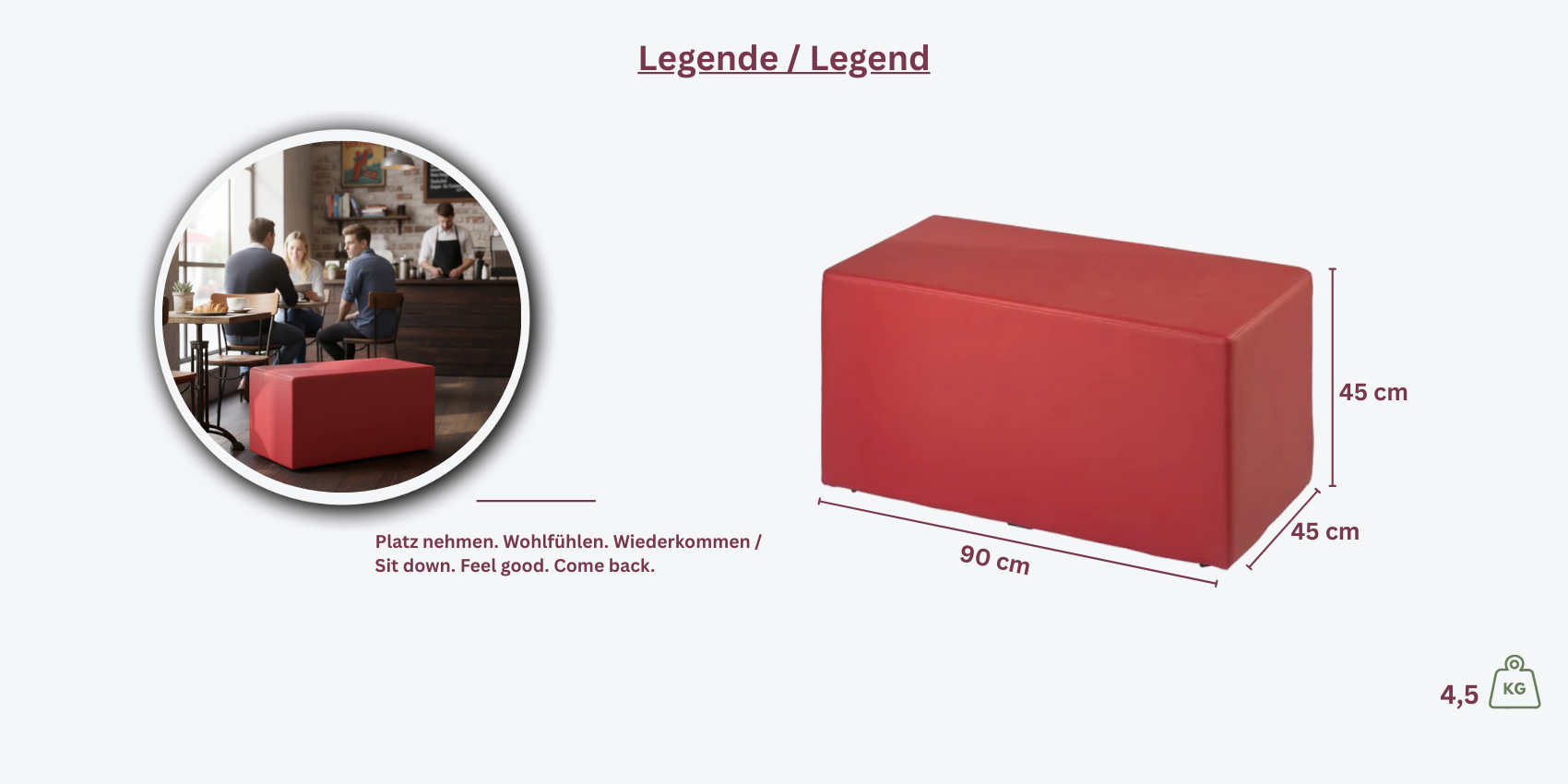 Mit dem Sitzwürfel London 90 setzen Sie auf moderne Ästhetik und großzügigen Komfort. Dank seiner größeren Abmessungen eignet er sich ideal für Lounges, Empfangsbereiche, Hotelzimmer oder Veranstaltungsflächen mit Designanspruch.