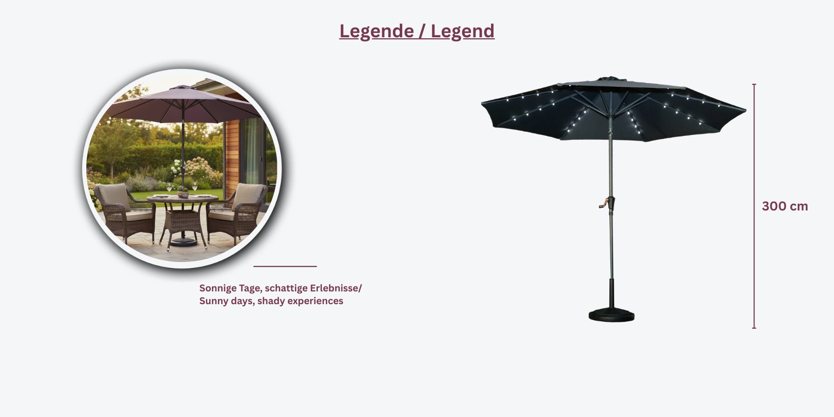 - Gesamtbreite: Ø300 cm (bietet großzügigen Schatten für einen komfortablen Außenbereich)