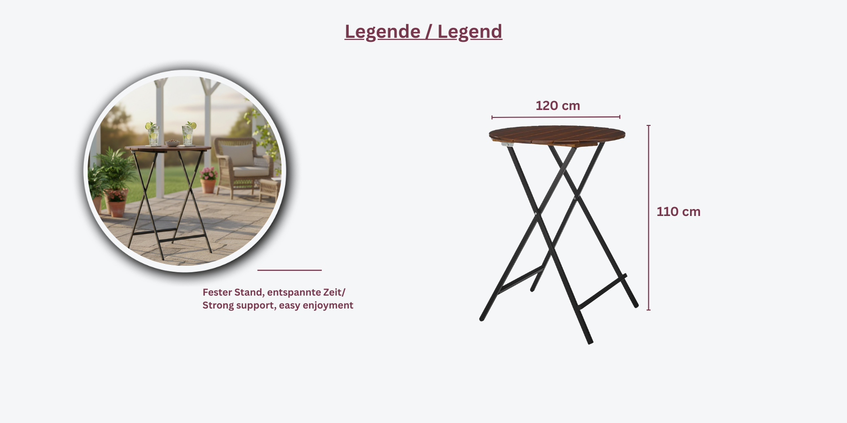 Der Stehtisch Rosenheim kombiniert Funktionalität mit klassischer Biergarten-Ästhetik. Dank seines klappbaren Stahlrohr-Gestells, das feuerverzinkt und pulverbeschichtet ist, bietet er maximale Stabilität und Langlebigkeit.