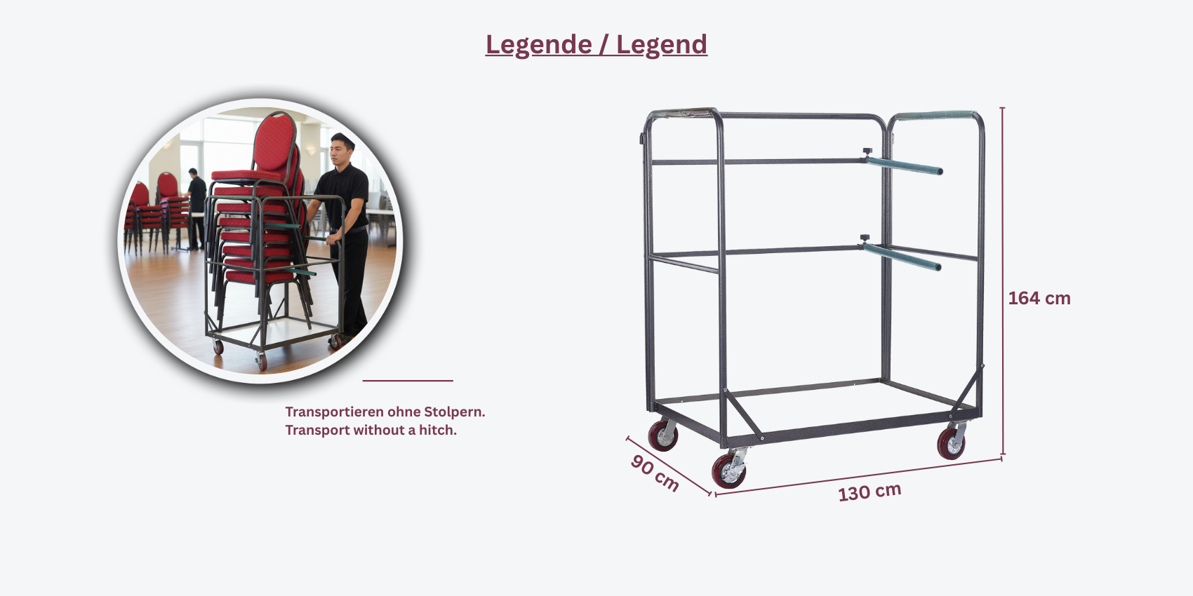 Der Stehtischwagen 50-L ist der perfekte Transportwagen für Stehtische, ideal für den gewerblichen Einsatz in Eventlocations, Konferenzräumen und mehr. Mit großen Rollen ausgestattet, ermöglicht er einen einfachen Transport auf nahezu jedem Bodenbelag.