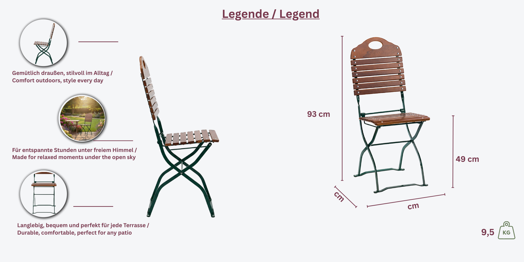 - Sitz: Eschenholzlattung, mehrfach lasiert für zusätzliche Haltbarkeit