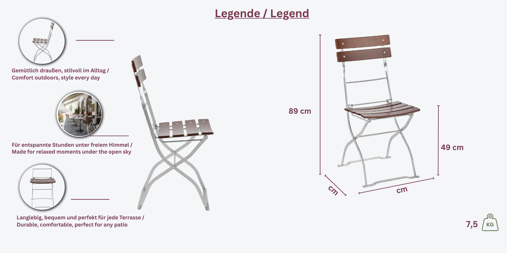Der Garden Emotions Biergartenstuhl Augsburg ist die ideale Wahl für jeden Biergarten. Klappbar und stilvoll erfüllt er alle Anforderungen an einen ausgezeichneten Terrassenstuhl. Das Gestell besteht aus Flachstahl, der feuerverzinkt oder pulverbeschichtet in Grün oder Schwarz erhältlich ist. Der Sitz ist aus Eschenholzlattung, die mehrfach dickschichtig lasiert wurde. Der Stuhl ist UV- und wetterbeständig, was ihn perfekt für den Einsatz bei jedem Wetter macht. Die abgebildete Farbe ist Kastanie.