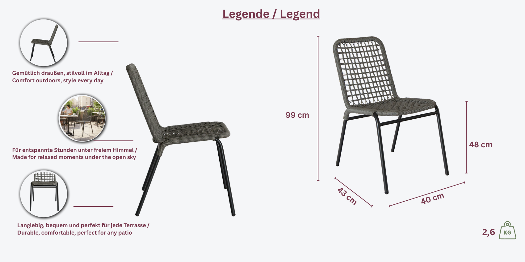 - Elegantes Erscheinungsbild: Der Stuhl Aurora in Anthrazit besticht durch sein modernes und stilvolles Design, das sich hervorragend in jede Outdoor-Umgebung integriert.