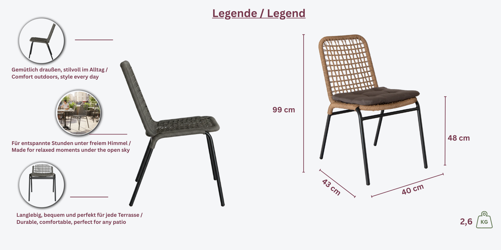 - Wetterfest und pflegeleicht: Dank der robusten, witterungsbeständigen Materialien ist der Stuhl ideal für den Outdoor-Einsatz und lässt sich einfach reinigen.