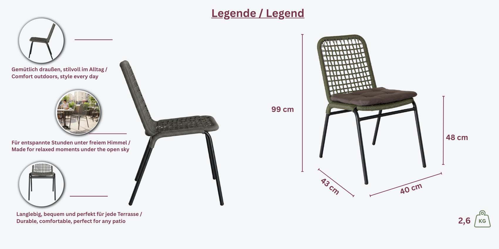 - Wetterfest und pflegeleicht: Dank der witterungsbeständigen Materialien ist der Stuhl ideal für den Einsatz im Freien und einfach zu reinigen.