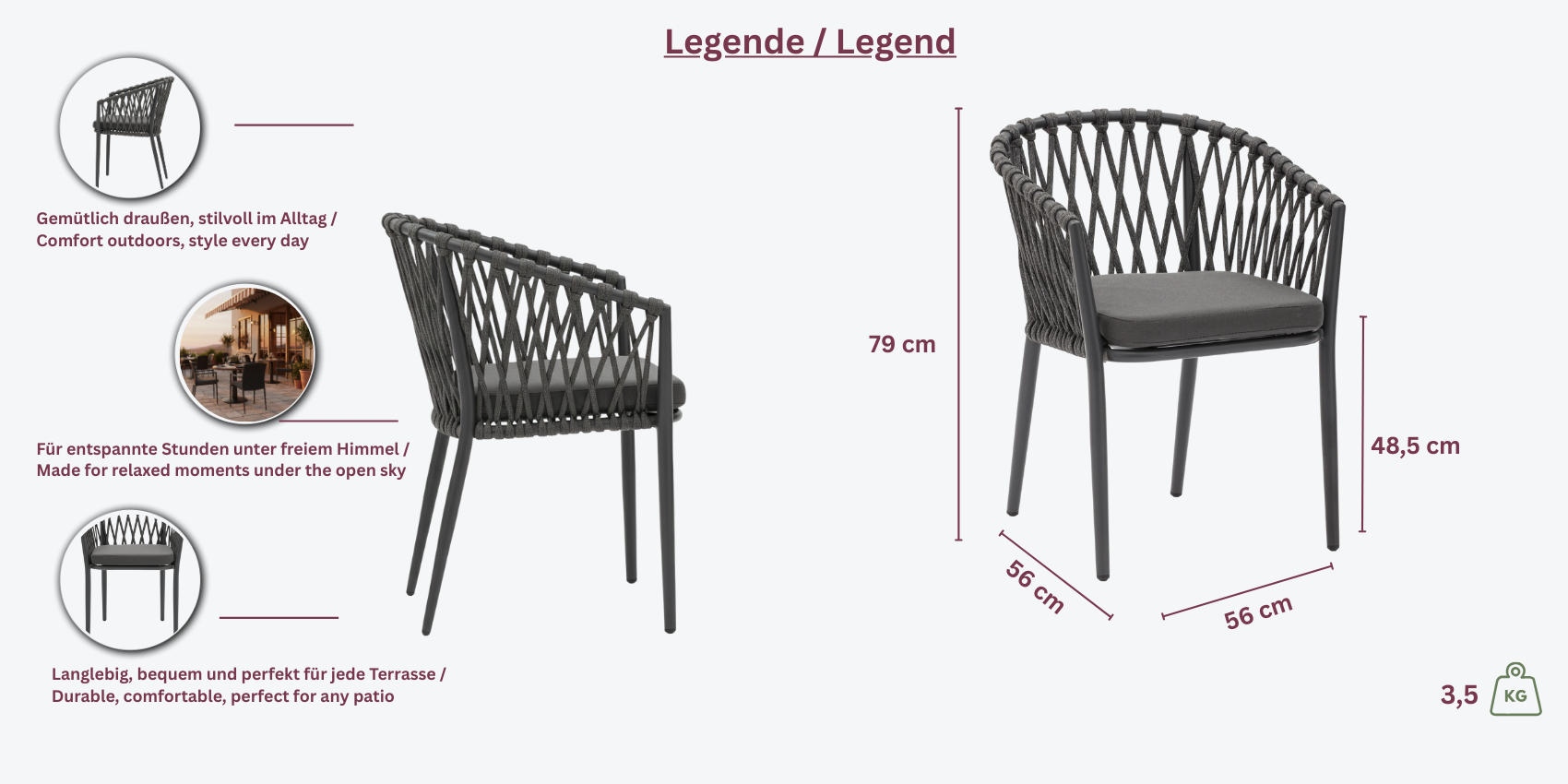 Der Garden Emotions Terrassenstuhl Dione ist einfach genial. Auf jeder Terrasse macht er eine umwerfende Figur. Mit dem inkludierten Sitzkissen in Anthrazit lässt es sich auf Ihrer Terrasse direkt wohler fühlen. Das Gestell besteht aus pulverbeschichtetem Aluminium in Anthrazit, und das Geflecht ist aus Seilgewebe in passendem Anthrazit gefertigt.