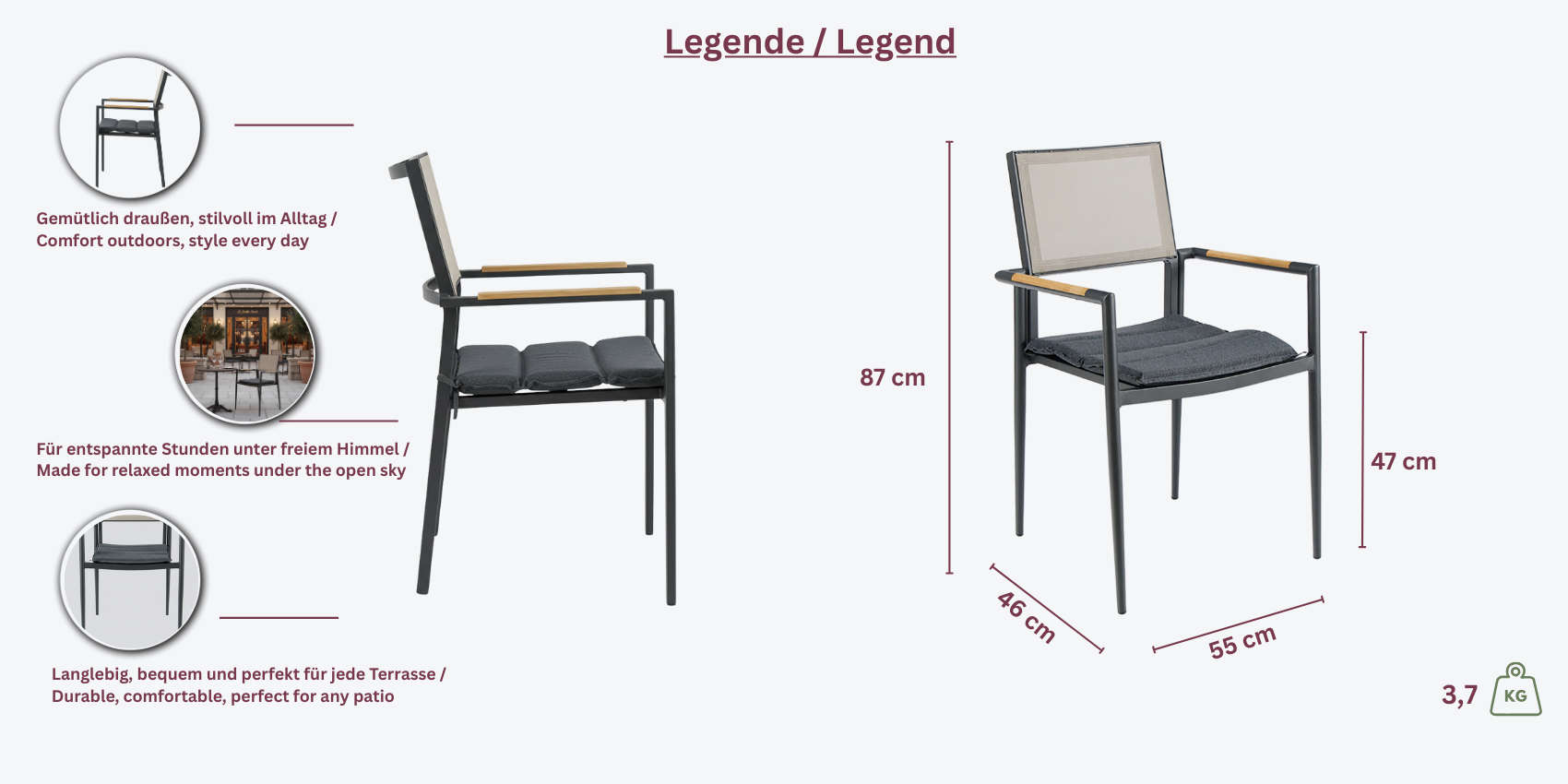 - Vielseitig einsetzbar: Der Kronos Stuhl ist sowohl für private Gärten und Terrassen als auch für den Einsatz in Gastronomie- oder Eventbereichen ideal geeignet.